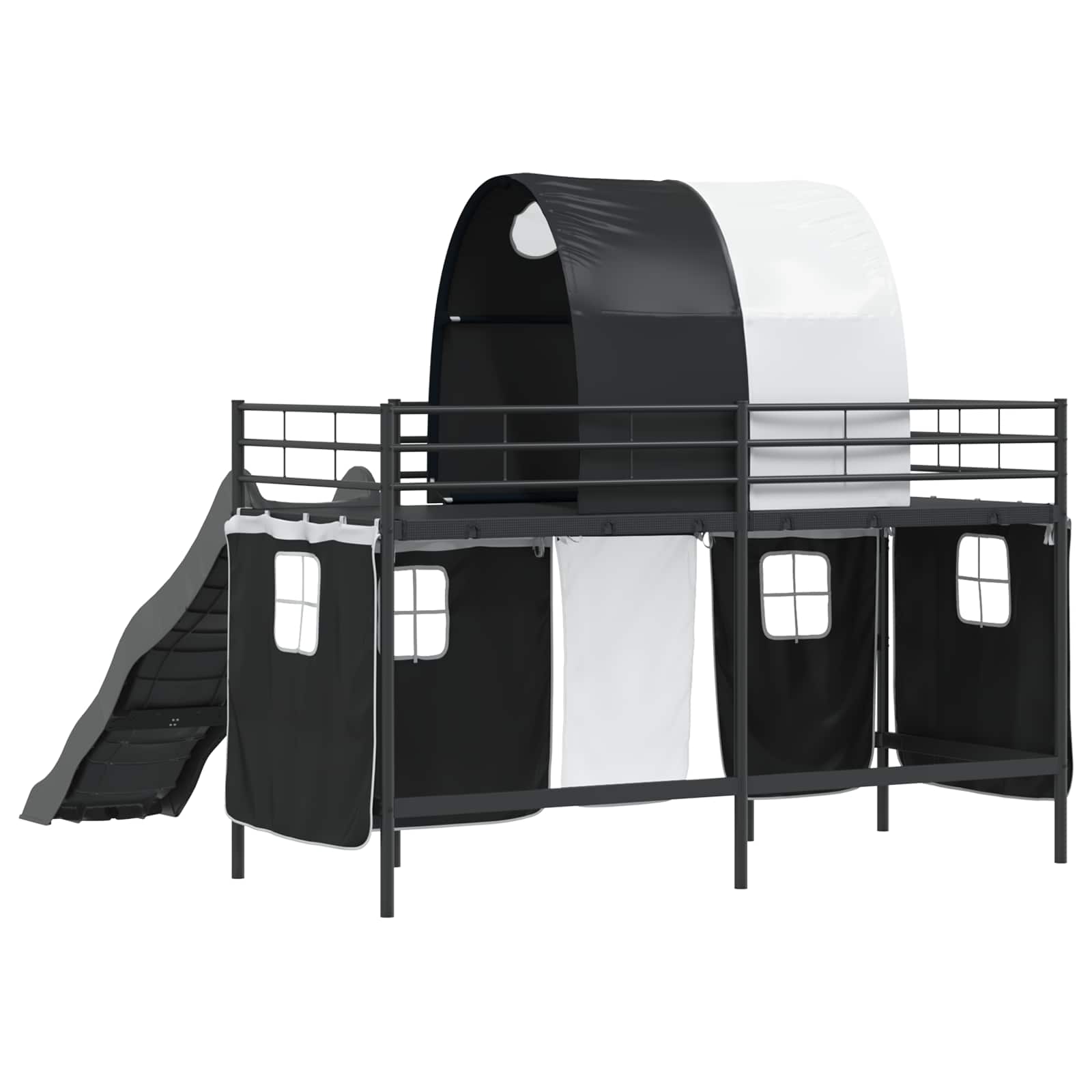 Dit stapelbedframe voor kinderen komt met gordijnen, een boog en een glijbaan, en is ontworpen om plezier te combineren met functionaliteit. Het biedt een geweldige slaapplek waar kleine avonturiers dol op zullen zijn. Dit rechthoekige frame heeft een strakke en moderne uitstraling, die perfect in elke slaapkamer of kinderkamer past. Met duurzame materialen en een speelse glijbaan, plus aanpasbare gordijnen, creëer je een gezellige omgeving voor zowel chillen als spelen. De zwart-blauwe kleuren geven een coole vibe aan elke ruimte, waardoor het zowel praktisch als spannend is.
