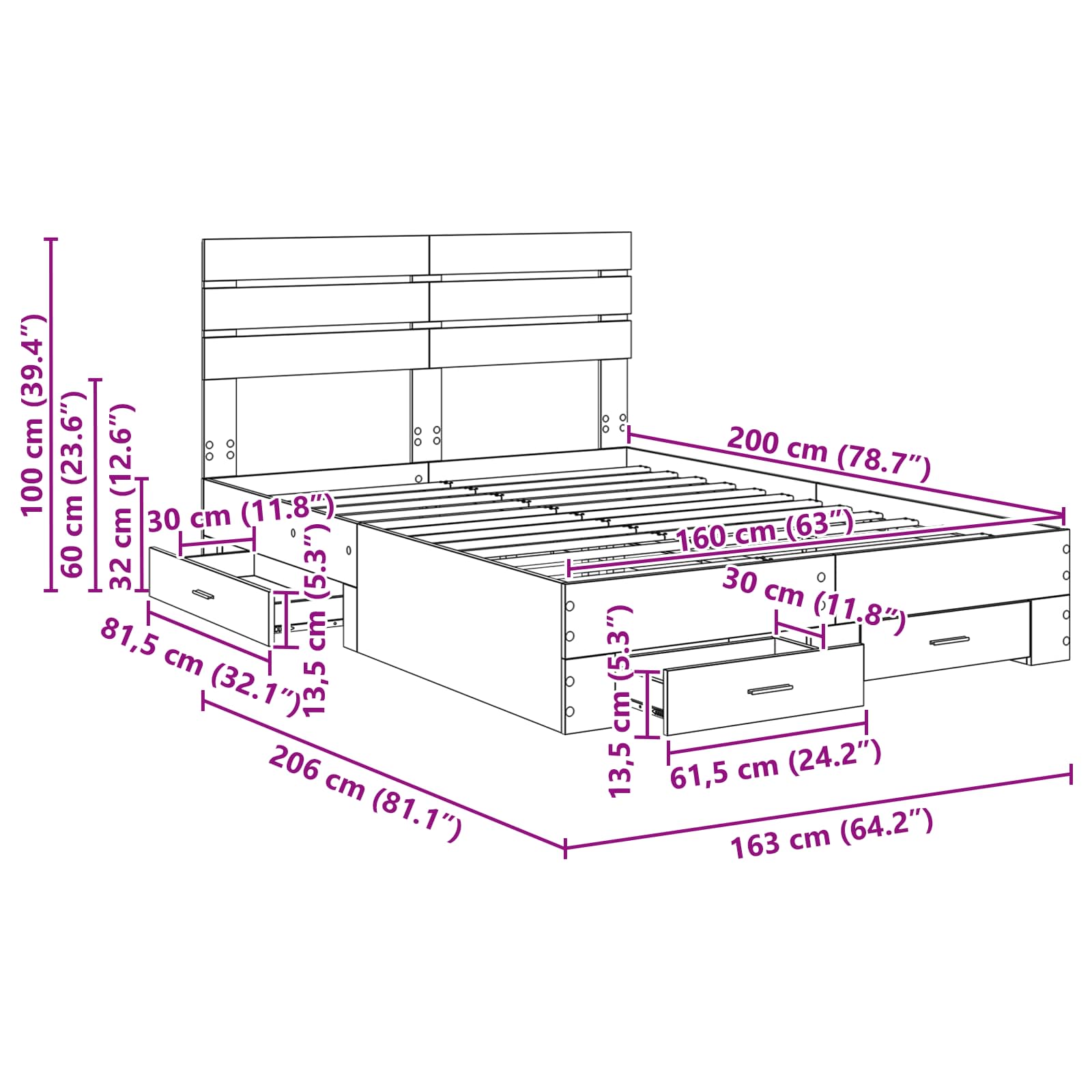 - Ergonomische handgrepen: De lades zijn voorzien van metalen handgrepen die soepel werken. Deze handgrepen combineren stijl met functionaliteit, waardoor het ontwerp van het bed totaal af is.