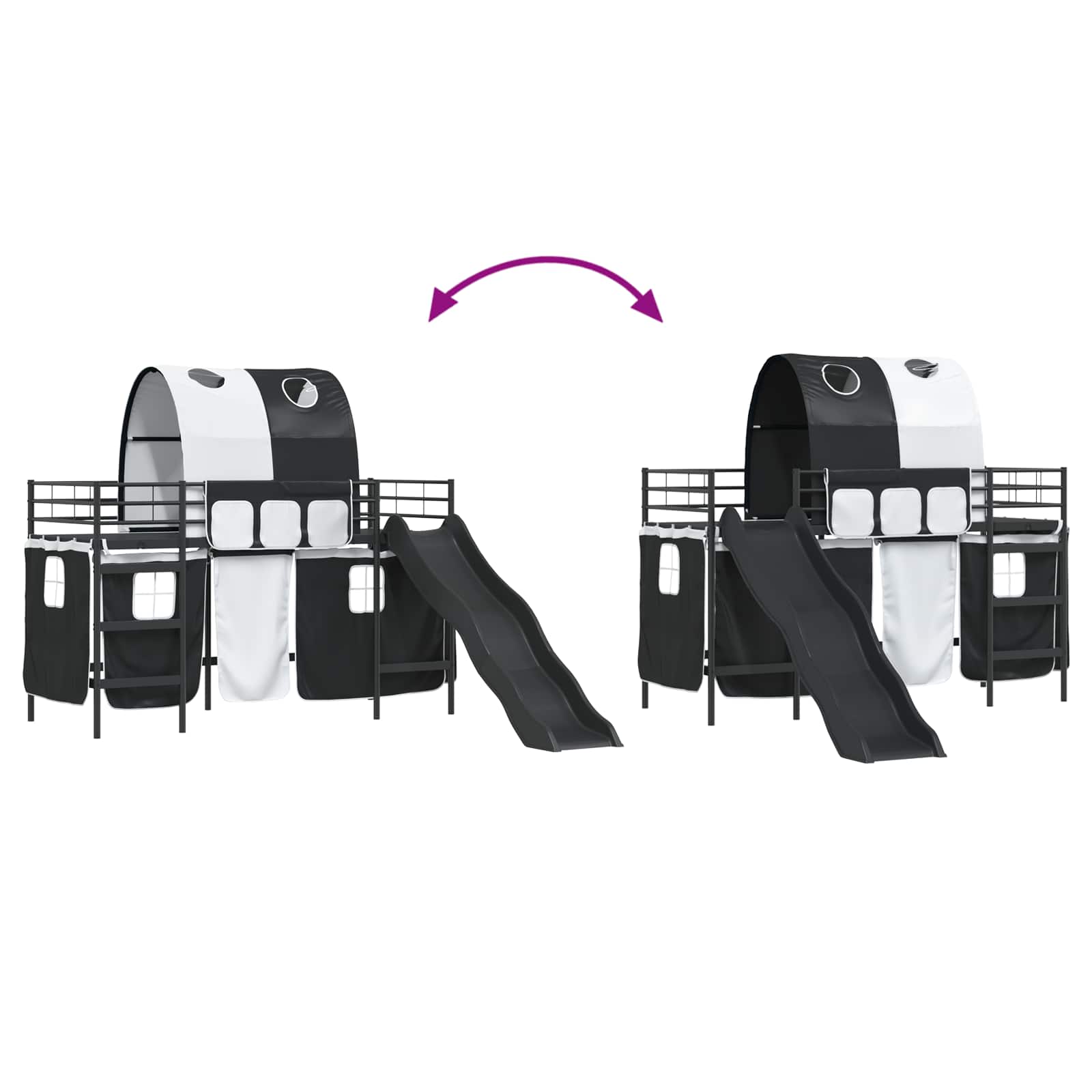 Dit stapelbedframe voor kinderen komt met gordijnen, een boog en een glijbaan, en is ontworpen om plezier te combineren met functionaliteit. Het biedt een geweldige slaapplek waar kleine avonturiers dol op zullen zijn. Dit rechthoekige frame heeft een strakke en moderne uitstraling, die perfect in elke slaapkamer of kinderkamer past. Met duurzame materialen en een speelse glijbaan, plus aanpasbare gordijnen, creëer je een gezellige omgeving voor zowel chillen als spelen. De zwart-blauwe kleuren geven een coole vibe aan elke ruimte, waardoor het zowel praktisch als spannend is.