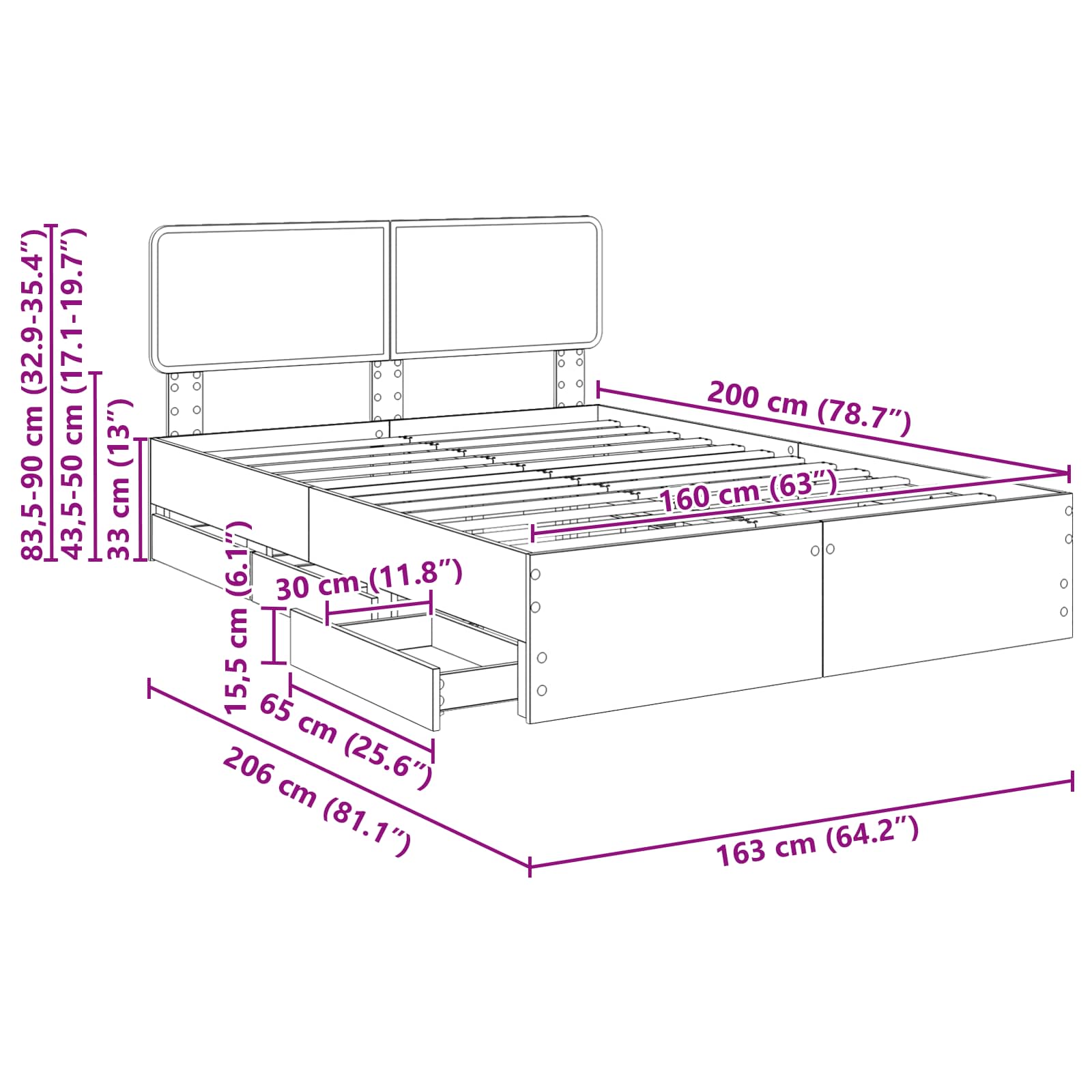 - Hoofdeinde maat: 163 x 3 x 90 cm (B x D x H)