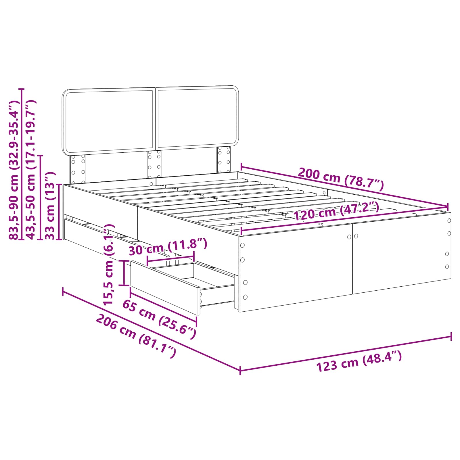 - Hoofdeinde maat: 123 x 3 x 90 cm (B x D x H)