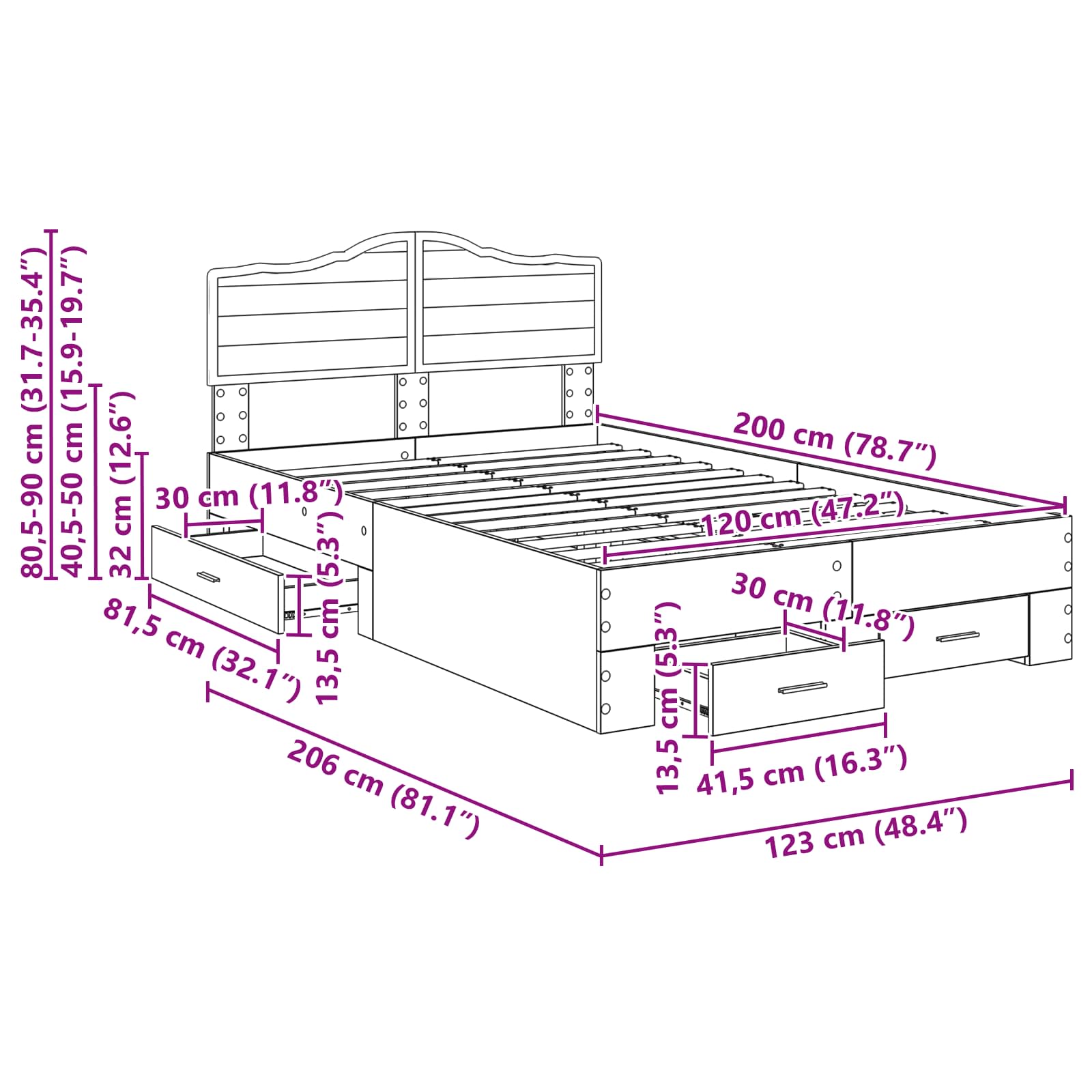 - Moderne kenmerken: Het bedframe staat op een handige hoogte van 32 cm, perfect om te combineren met jouw favoriete matras. Het ontwerp maakt de montage eenvoudig en het ziet er strak uit, met slanke zilveren handgrepen op de laden voor een eigentijdse uitstraling.