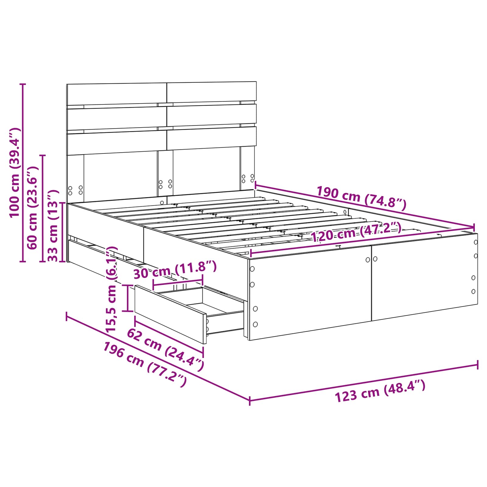 - Algemene afmetingen: 193 x 123 x 100 cm (L x B x H)