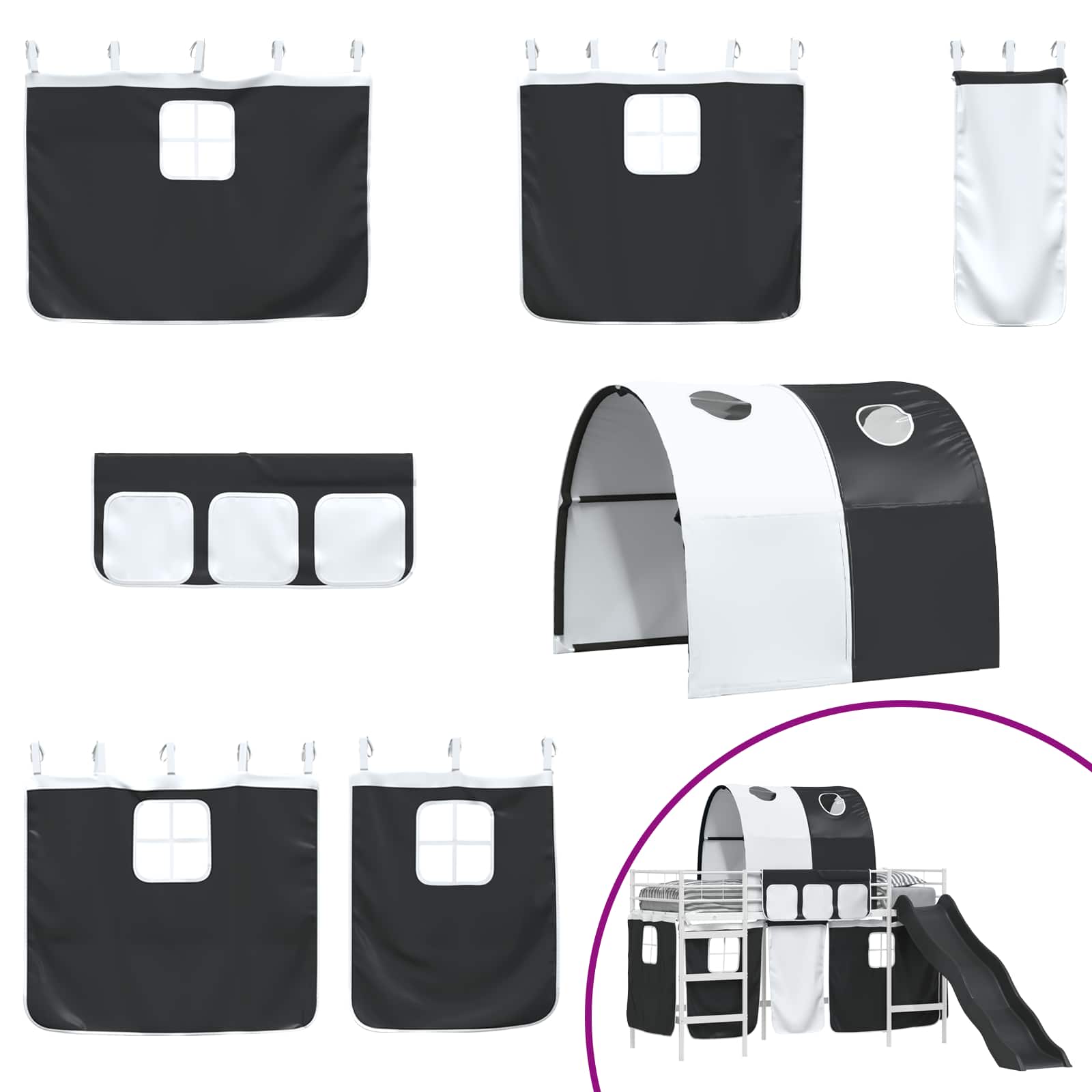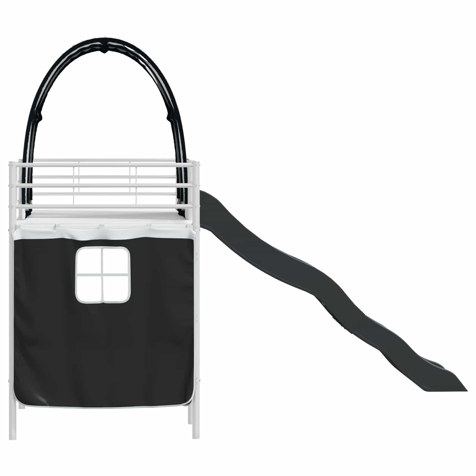 Dit stapelbedframe voor kinderen komt met gordijnen, een boog en een glijbaan, en is ontworpen om plezier te combineren met functionaliteit. Het biedt een geweldige slaapplek waar kleine avonturiers dol op zullen zijn. Dit rechthoekige frame heeft een strakke en moderne uitstraling, die perfect in elke slaapkamer of kinderkamer past. Met duurzame materialen en een speelse glijbaan, plus aanpasbare gordijnen, creëer je een gezellige omgeving voor zowel chillen als spelen. De zwart-blauwe kleuren geven een coole vibe aan elke ruimte, waardoor het zowel praktisch als spannend is.