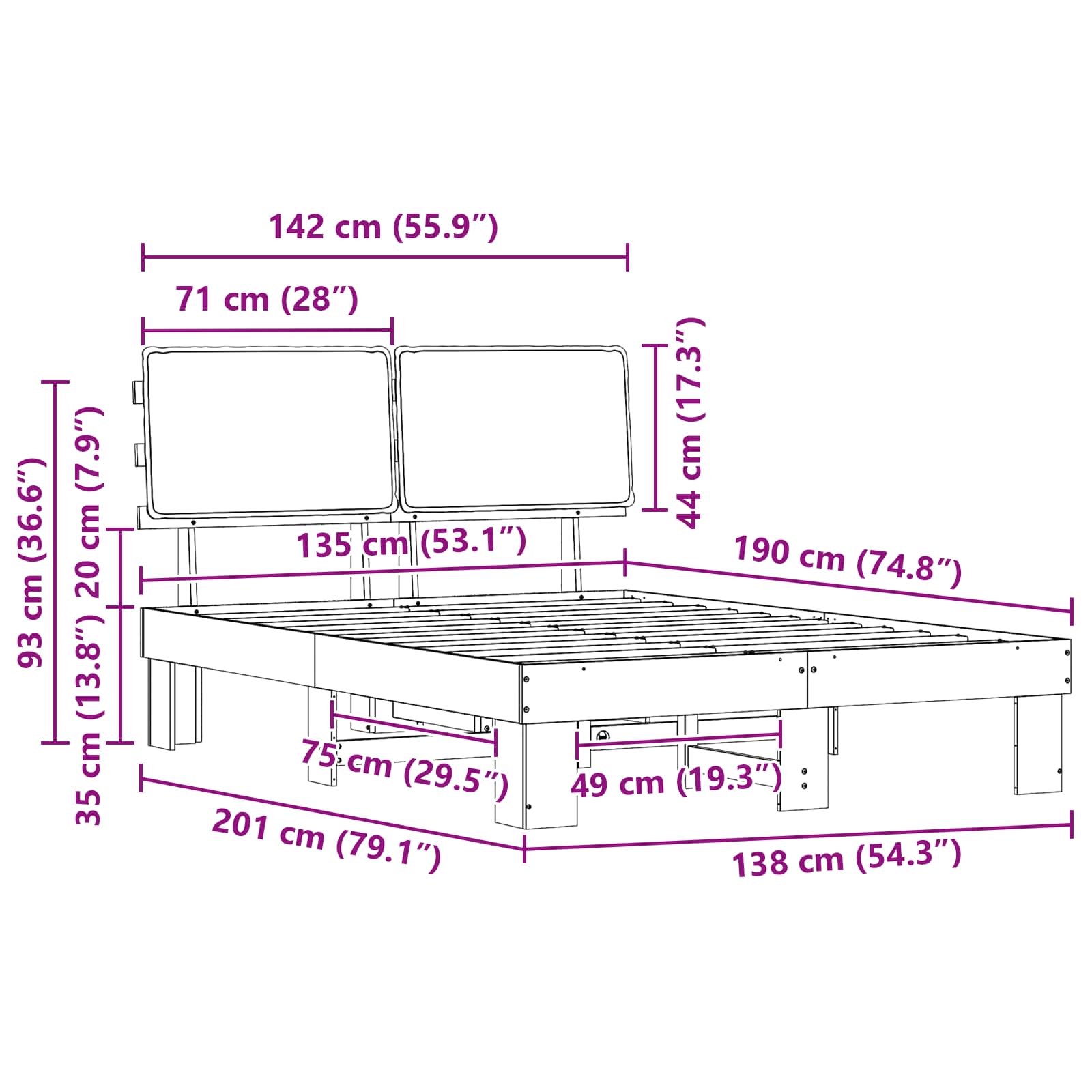 - Algemene afmetingen: 201 x 138 x 93 cm (L x B x H)