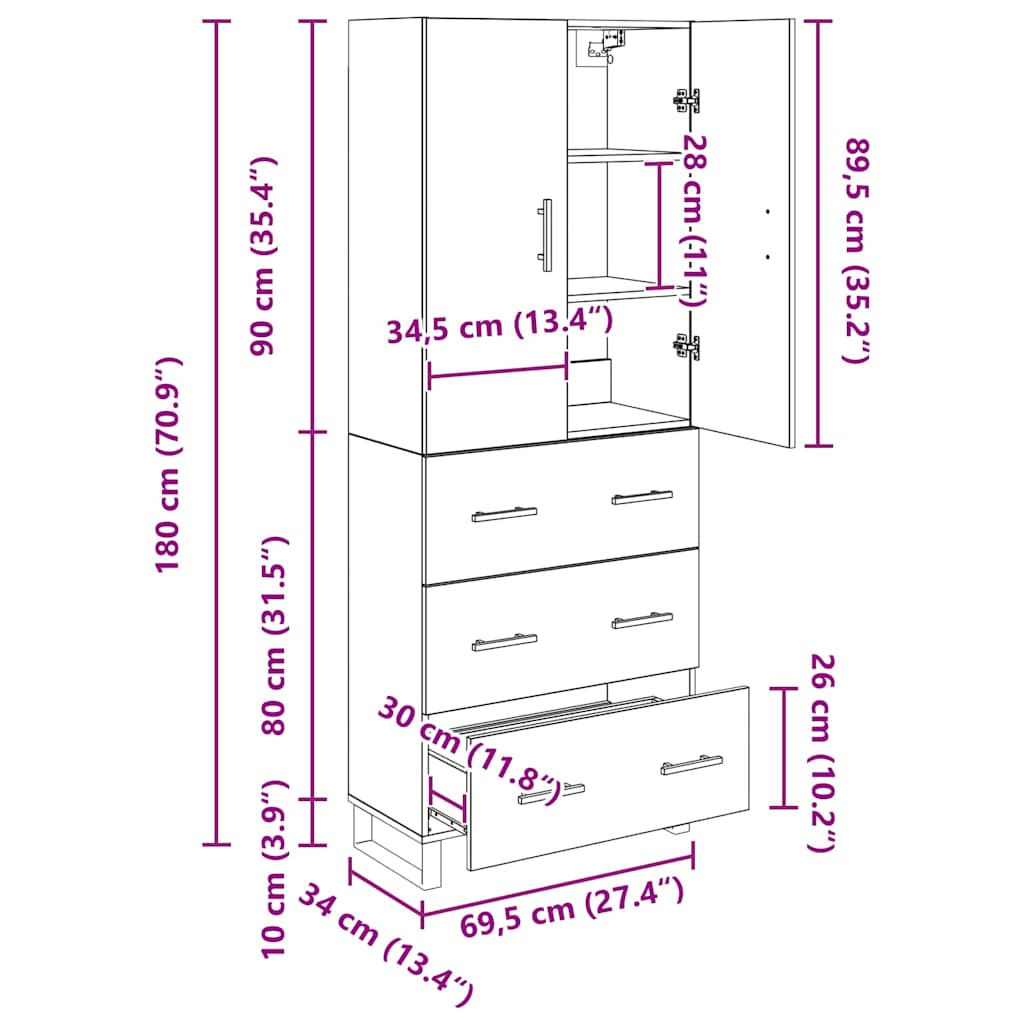 - Bewerkt houtconstructie: De highboard is gemaakt van duurzaam bewerkt hout, dat sterk is en tegen dagelijks gebruik kan. Dit materiaal geeft een strakke, gladde afwerking die in elke kamer past. Het blijft er altijd goed uitzien, wat het ideaal maakt voor drukke gezinnen.