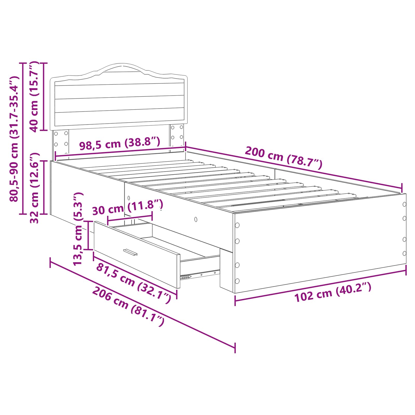 - Matrasmaat: Brede eenpersoonsbed (100 cm x 200 cm / 39" x 79")