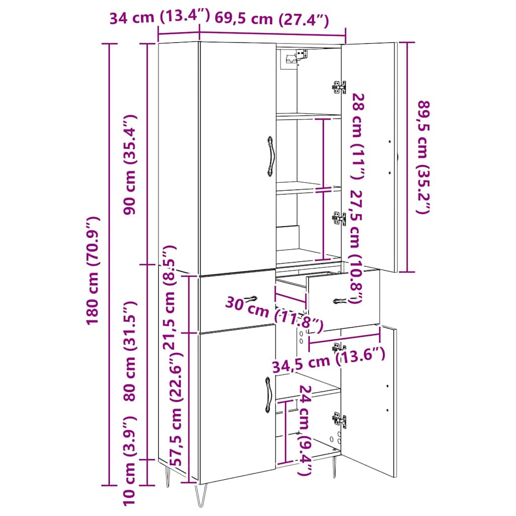 - Totale afmetingen: 69,5 x 34 x 180 cm (L x B x H)