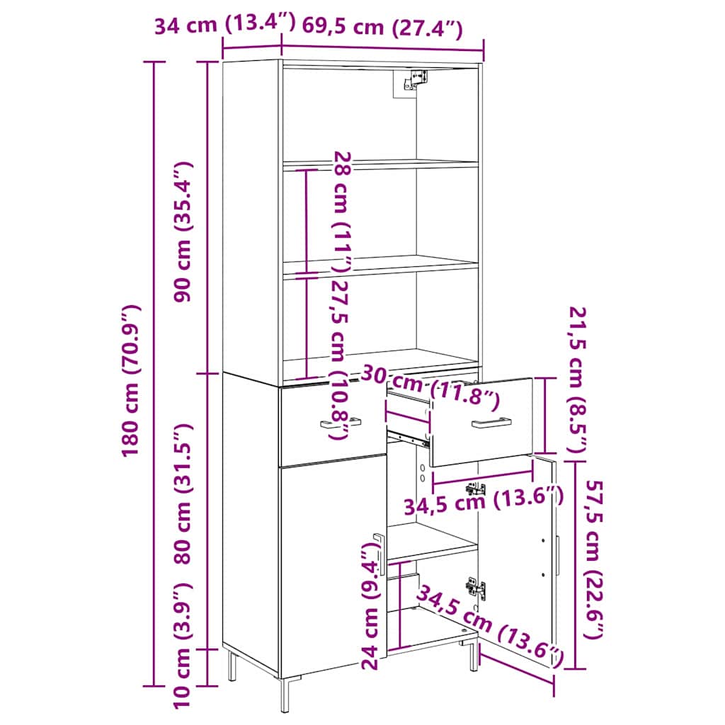 - Totale afmetingen: 69,5 x 34 x 180 cm (L x B x H)