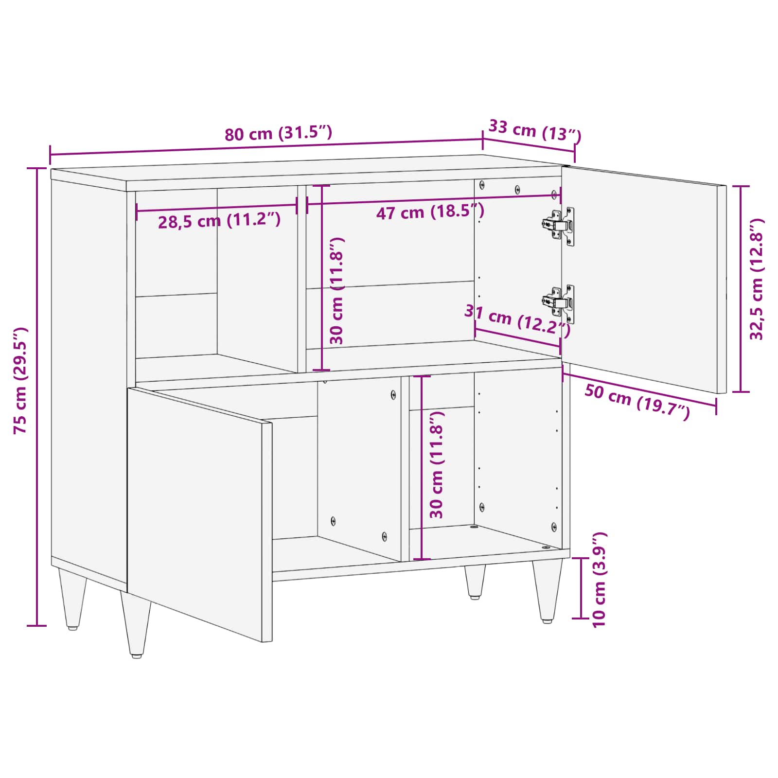 - Totale afmetingen: 80 x 33,5 x 75 cm (L x B x H)
