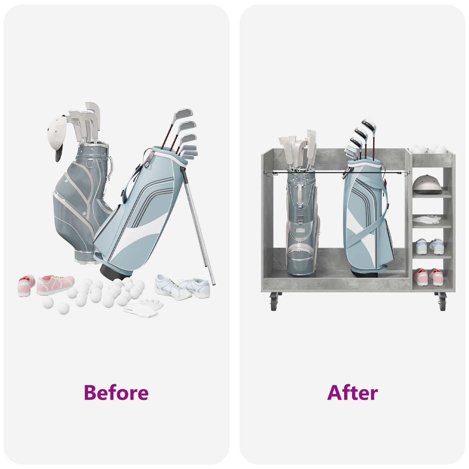 - Aangeraden Gebruik: Perfect voor garages of binnenruimtes waar je veelzijdige opslag nodig hebt. Of het nu gaat om golfuitrusting of andere spullen, het kan overal staan waar het past. Dit meubel gaat verder dan alleen sport en is ook handig voor andere opslagbehoeften.