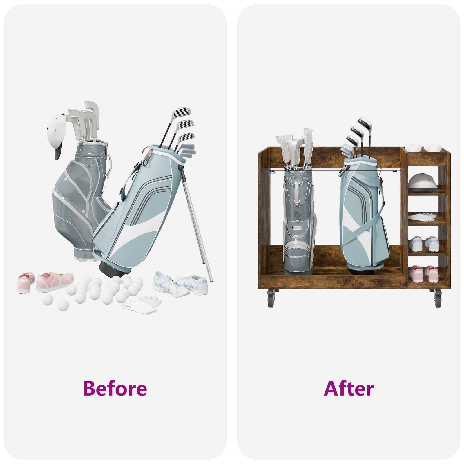 - Aangeraden Gebruik: Perfect voor garages of binnenruimtes waar je veelzijdige opslag nodig hebt. Of het nu gaat om golfuitrusting of andere spullen, het kan overal staan waar het past. Dit meubel gaat verder dan alleen sport en is ook handig voor andere opslagbehoeften.