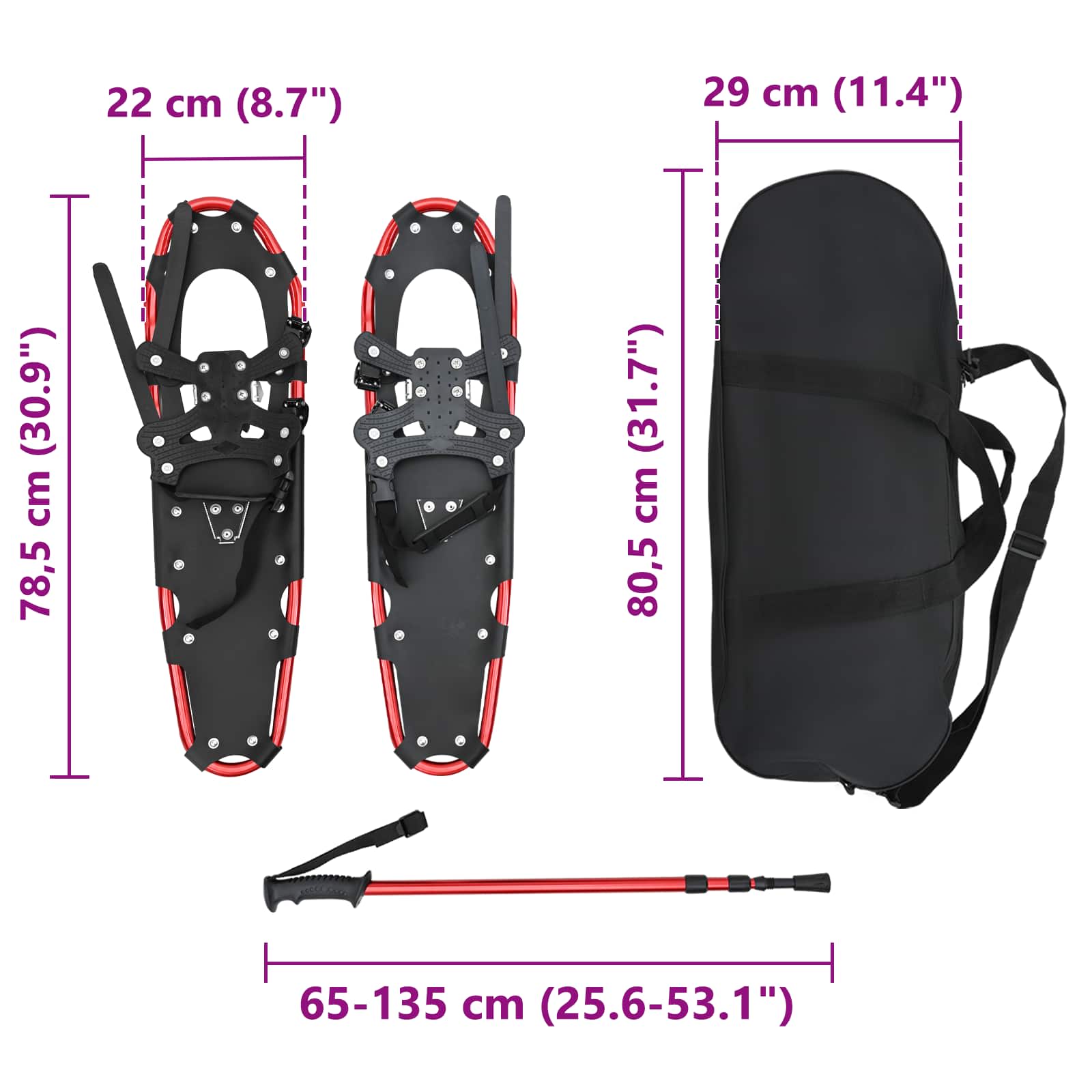 - Complete set: In de verpakking vind je sneeuwschoenen, verstelbare wandelstokken en een handige tas, ideaal voor wie alles in één keer wil kopen. Elk onderdeel is ontworpen voor makkelijk transport en opbergen, dus je bent altijd klaar voor je avontuur.