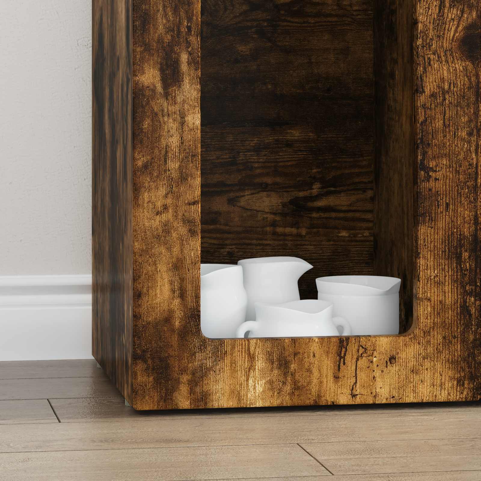 - Materialen: Dit moderne dressoir is helemaal gemaakt van gebakken hout, wat zorgt voor een sterke en betrouwbare structuur. Gebakken hout, dat staat voor duurzaamheid en topkwaliteit, wordt gebruikt voor het hoofdkader, de achterkant, het oppervlak en de planken. Deze materialen zorgen ervoor dat het dressoir lang meegaat en er mooi blijft uitzien, terwijl het ook een strakke, samenhangende look heeft die perfect past in hedendaagse interieurs.