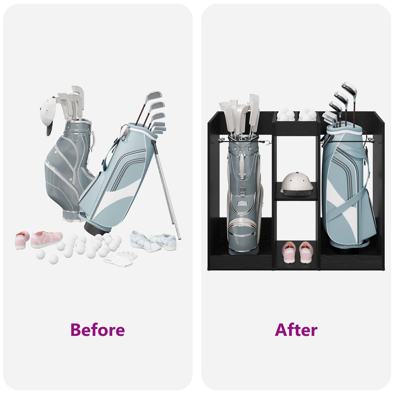 - Aangeraden Gebruik: Perfect voor garages of binnenruimtes waar je veelzijdige opslag nodig hebt. Of het nu gaat om golfuitrusting of andere spullen, het kan overal staan waar het past. Dit meubel gaat verder dan alleen sport en is ook handig voor andere opslagbehoeften.
