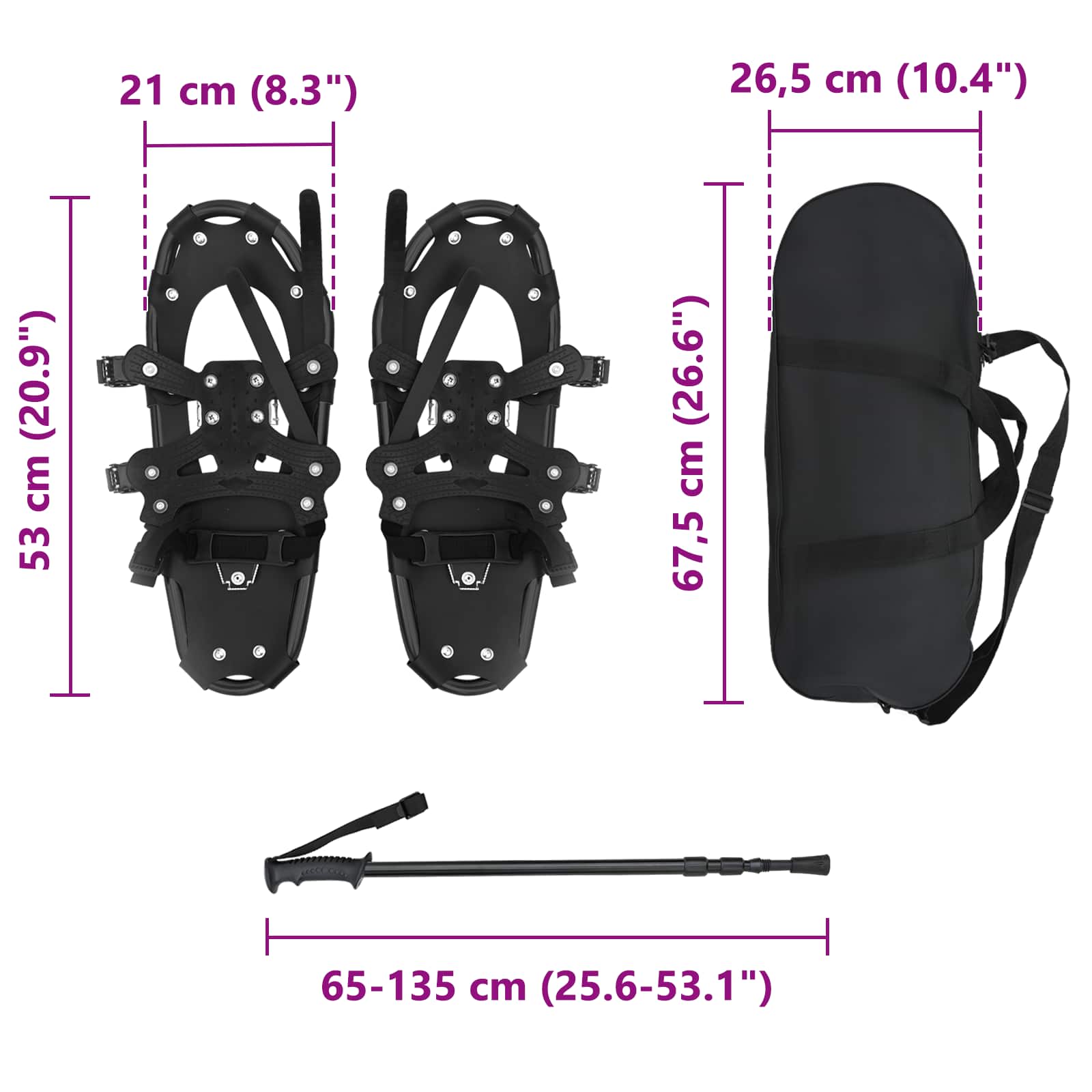 - Complete set: In de verpakking vind je sneeuwschoenen, verstelbare wandelstokken en een handige tas, ideaal voor wie alles in één keer wil kopen. Elk onderdeel is ontworpen voor makkelijk transport en opbergen, dus je bent altijd klaar voor je avontuur.