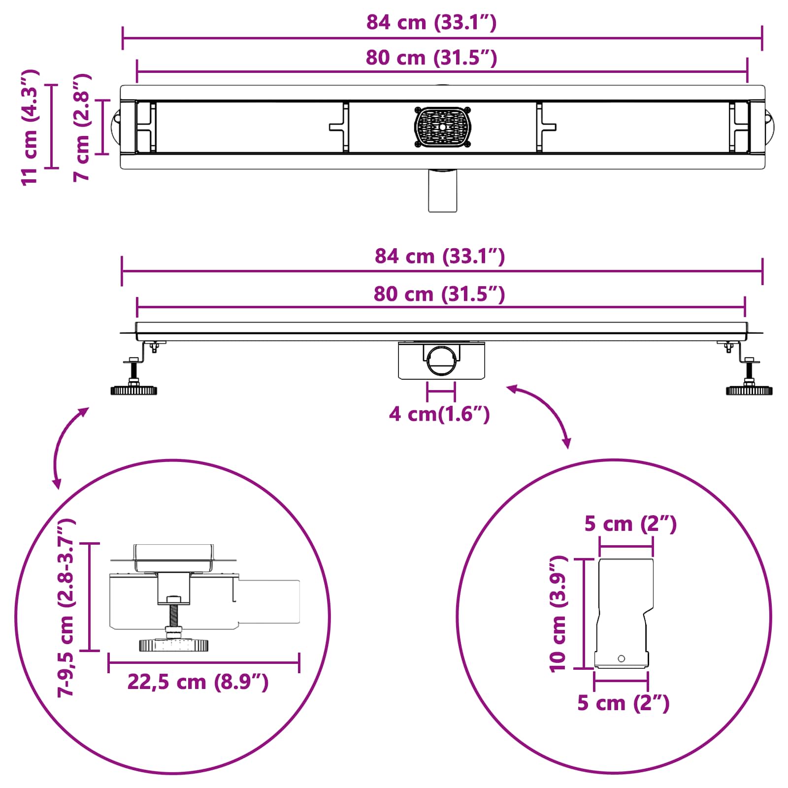 - Roestvrij staal constructie: Gemaakt van hoogwaardig roestvrij staal 304, heeft deze douchegoot een glad oppervlak dat vlekken afschrikt. De sterke duurzaamheid zorgt ervoor dat hij jarenlang betrouwbaar werkt, wat bijdraagt aan een geweldige badkamerervaring.