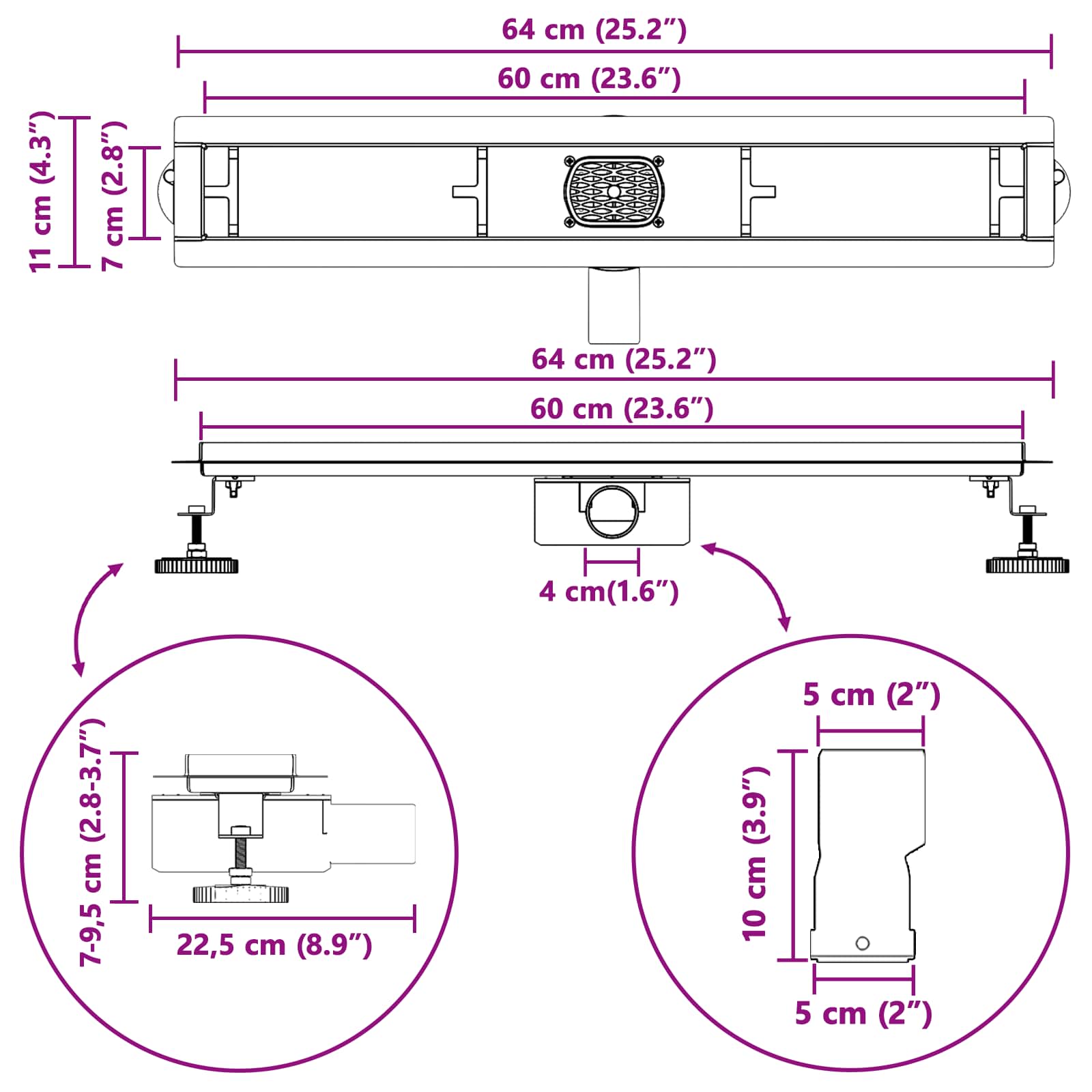 - Roestvrij staal constructie: Gemaakt van hoogwaardig roestvrij staal 304, heeft deze douchegoot een glad oppervlak dat vlekken afschrikt. De sterke duurzaamheid zorgt ervoor dat hij jarenlang betrouwbaar werkt, wat bijdraagt aan een geweldige badkamerervaring.