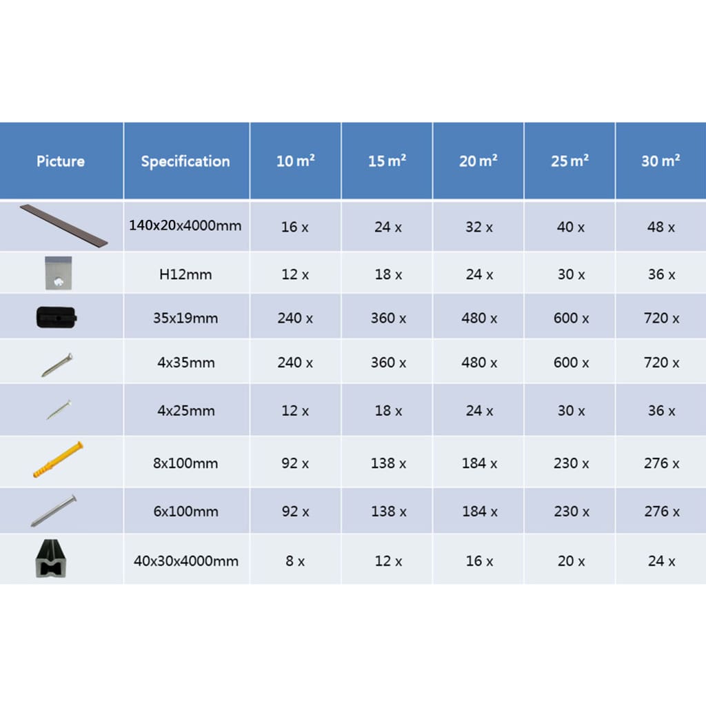 Onze terrasplanken zijn gemaakt van hoogwaardig hout-kunststof-composiet en zijn waterbestendig en zeer duurzaam. De terrasplanken zijn 20 mm dik waardoor ze supersterk zijn. Bovendien hebben deze terrasplanken aan elke kant een ander patroon. De levering bevat 40 terrasplanken, 20 kielen, 600 kunststof klemmen, 630 roestvrijstalen schroeven, 230 kunststof uitbreidingsschroeven en 30 roestvrijstalen startklemmen. Deze set is eenvoudig te monteren.