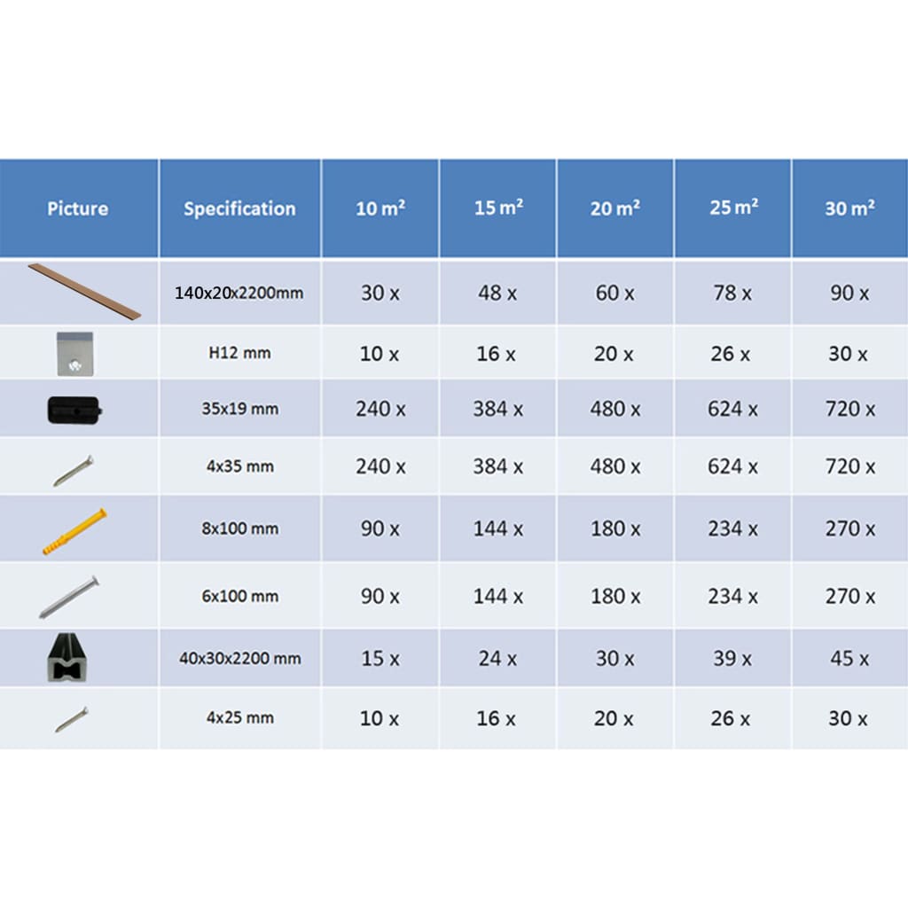 Onze terrasplanken zijn gemaakt van hoogwaardig hout-kunststof-composiet en zijn waterbestendig en zeer duurzaam. De terrasplanken zijn 20 mm dik waardoor ze supersterk zijn. Bovendien hebben deze terrasplanken aan elke kant een ander patroon. De levering bevat 90 terrasplanken, 45 kielen, 720 kunststof klemmen, 750 roestvrijstalen schroeven, 270 kunststof uitbreidingsschroeven en 30 roestvrijstalen startklemmen. Deze set is eenvoudig te monteren.