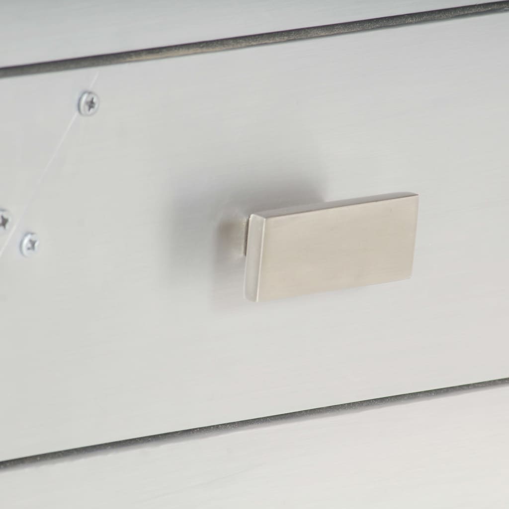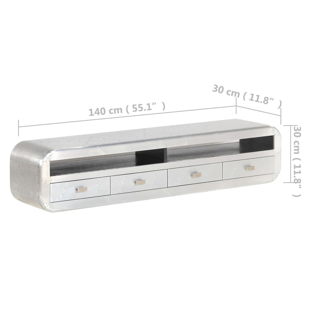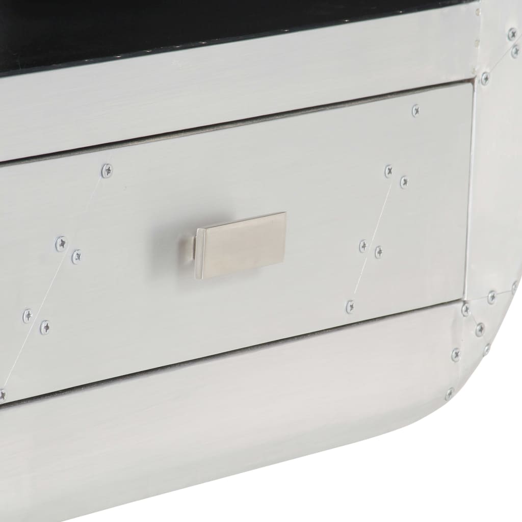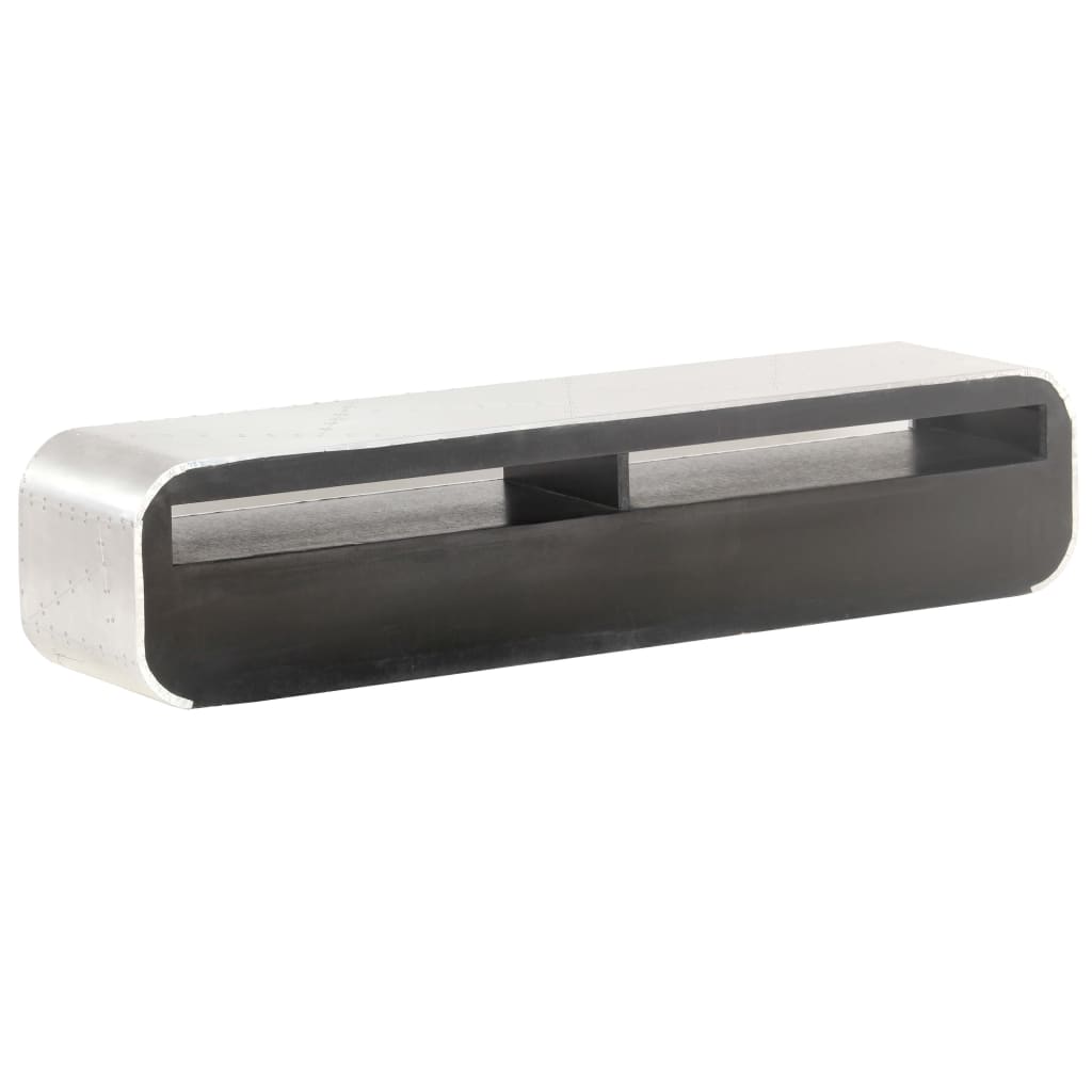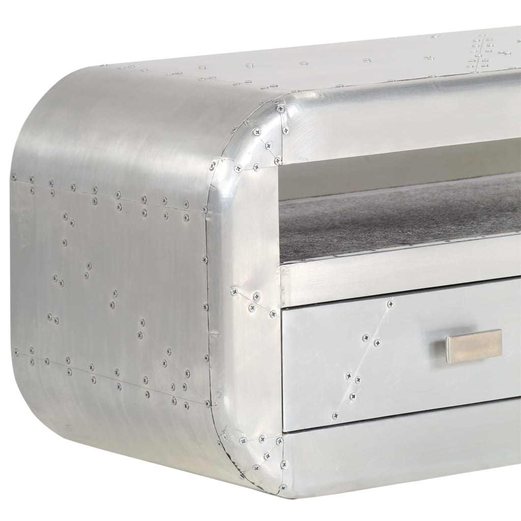 Het tv-meubel in luchtvaartstijl is gemaakt van massief mangohout en het oppervlak is bekleed met stukjes gepolijst aluminium die geaccentueerd zijn met stalen schroeven. Hierdoor is het meubel extreem duurzaam. Gladde randen en de retro handvatten geven de tv-standaard een unieke uitstraling.