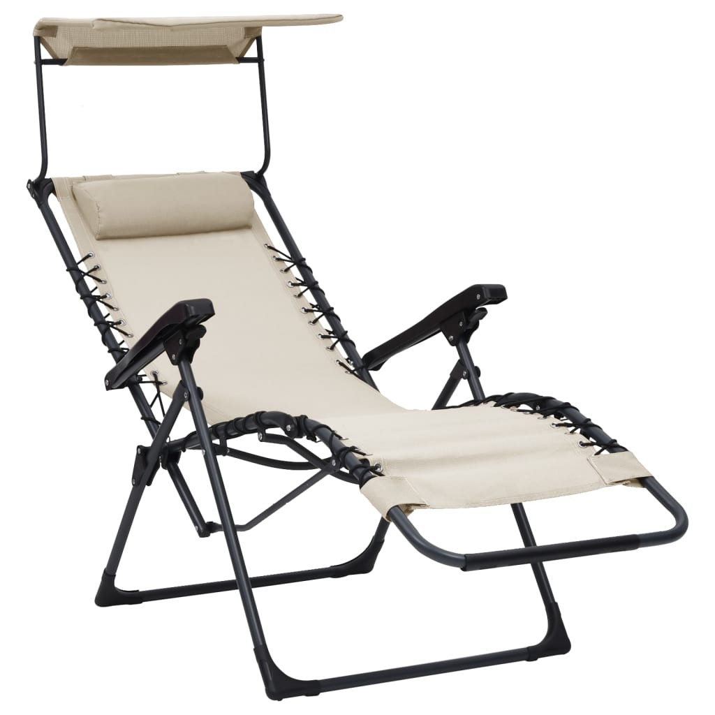 De tuinstoel heeft een stevig stalen frame en een makkelijk schoon te maken, weerbestendige zitting en rugleuning van textileen, wat zeer duurzaam is. De gewatteerde hoofdsteun is zacht en comfortabel. Daarnaast heeft deze buitenstoel een luifel voor koele schaduw onder de zon. Bovendien is de stoel lichtgewicht en kan hij dus makkelijk worden verplaatst. Hij is inklapbaar om ruimte te besparen.