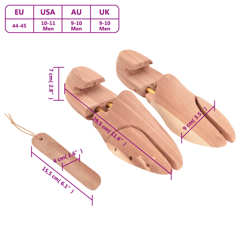- Massief cederhout: de schoenspanner is gemaakt van natuurlijk cederhout, dat vocht absorbeert, een aangename geur afgeeft en helpt om de vorm van met name leren schoenen te behouden en hun levensduur te verlengen.