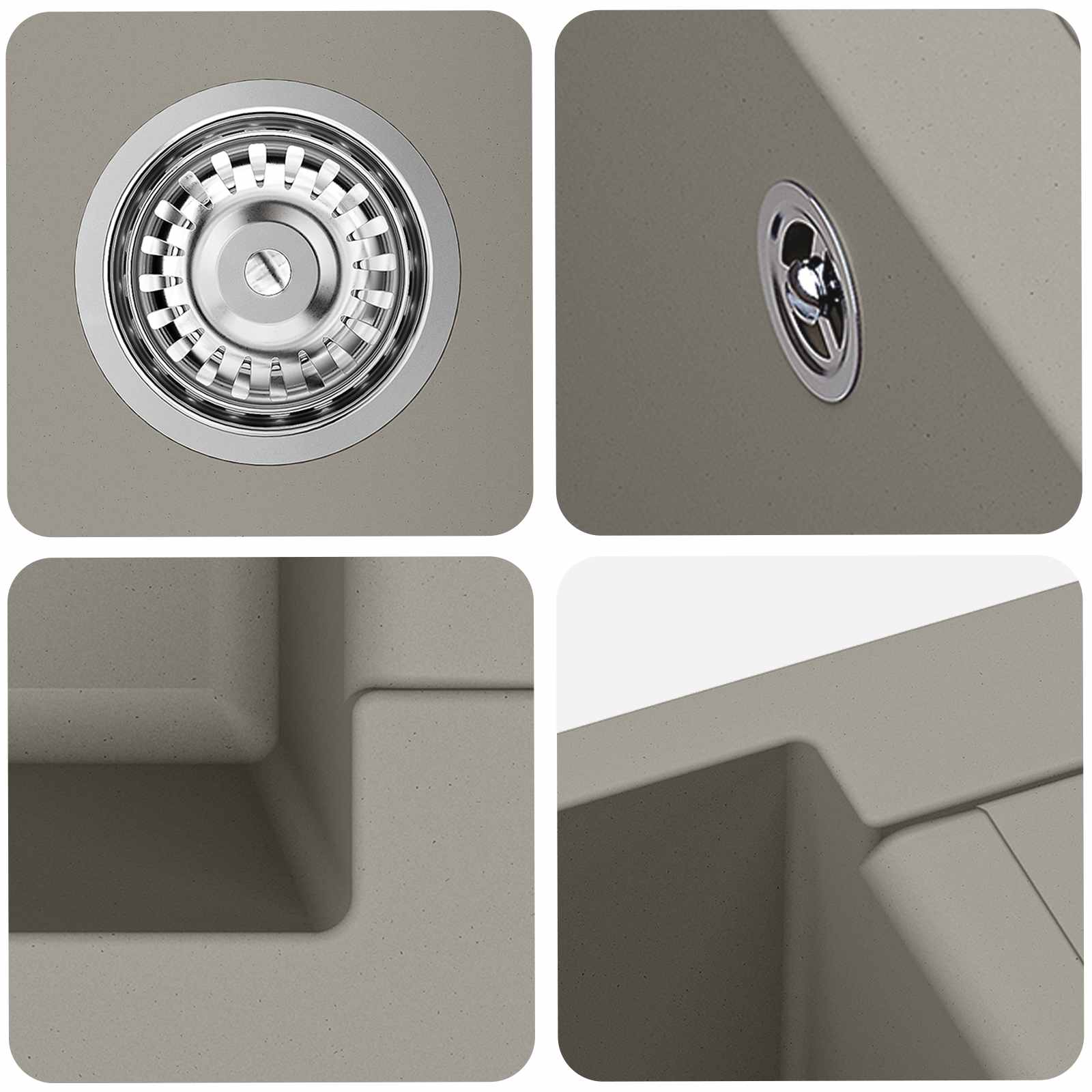 - Materialen: De gootsteen is gemaakt van een sterke mix van 80% kwarts en 20% hars, wat zorgt voor een stevige en duurzame constructie die goed bestand is tegen afschilferen en krassen, zelfs bij dagelijks gebruik in een drukke keuken.