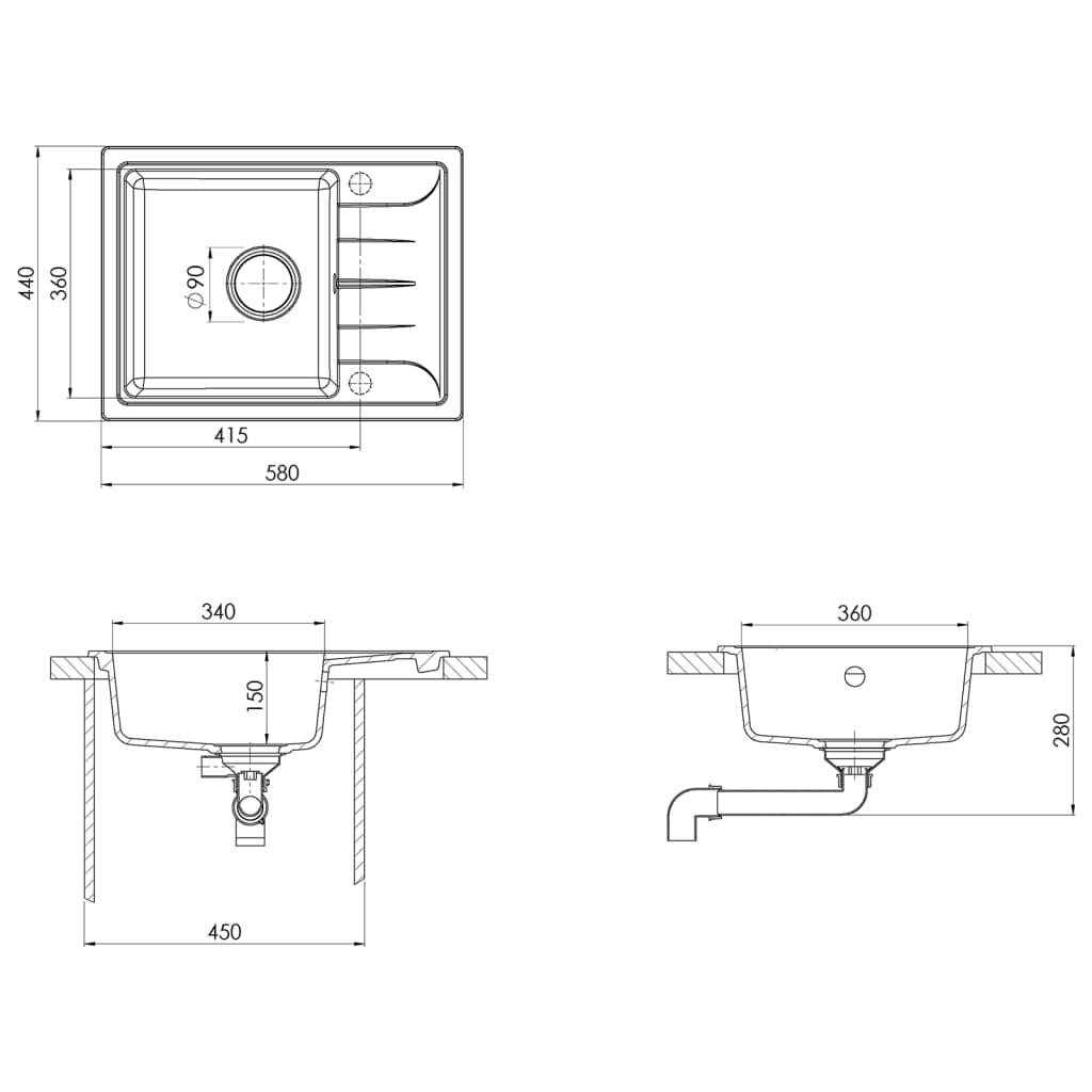 De wastafel is gemaakt van graniet waardoor hij hittebestendig, kras- en slagvast en gemakkelijk schoon te maken is. Het afdruipgedeelte aan de zijkant geeft je extra ruimte voor je afwas. Doordat de spoelbak volledig omkeerbaar is, kan hij zowel links als rechts worden gemonteerd. Een zeefje om vuil gemakkelijk te verwijderen is ook inbegrepen. Het afloopgat is 90 mm in diameter.