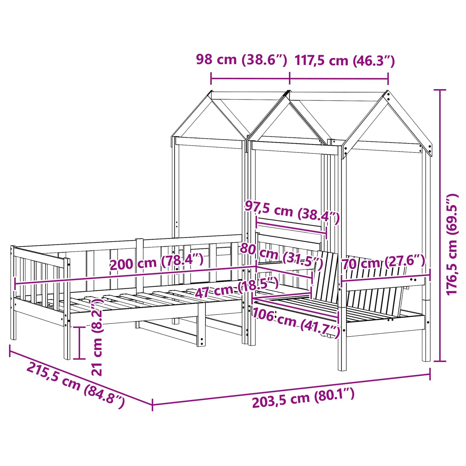 - 1 x Beddak: 108 x 70 x 176.5 cm (L x B x H)