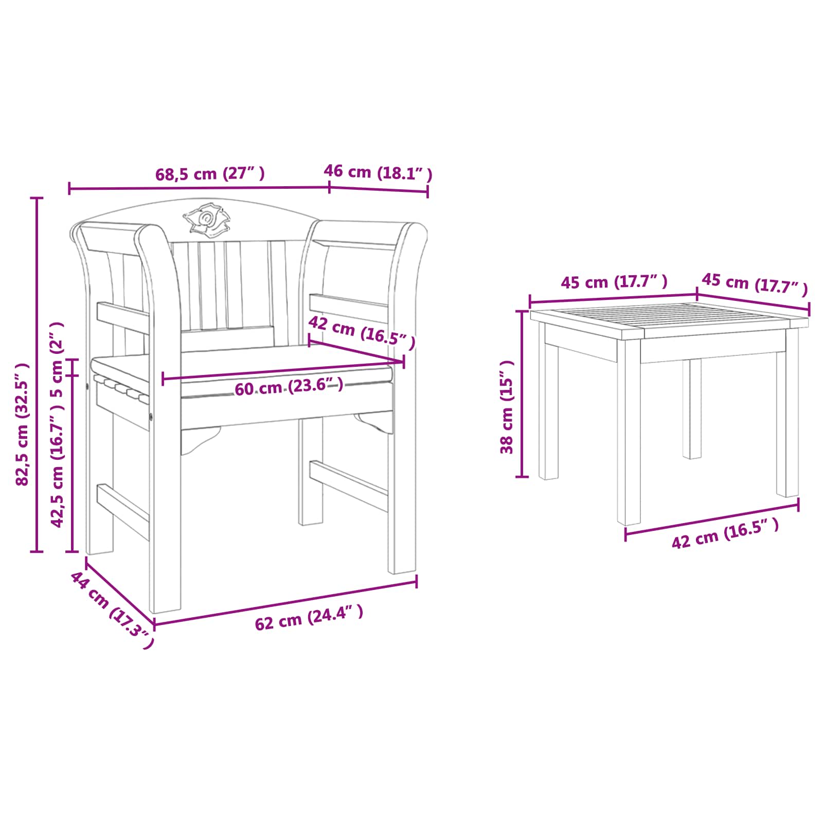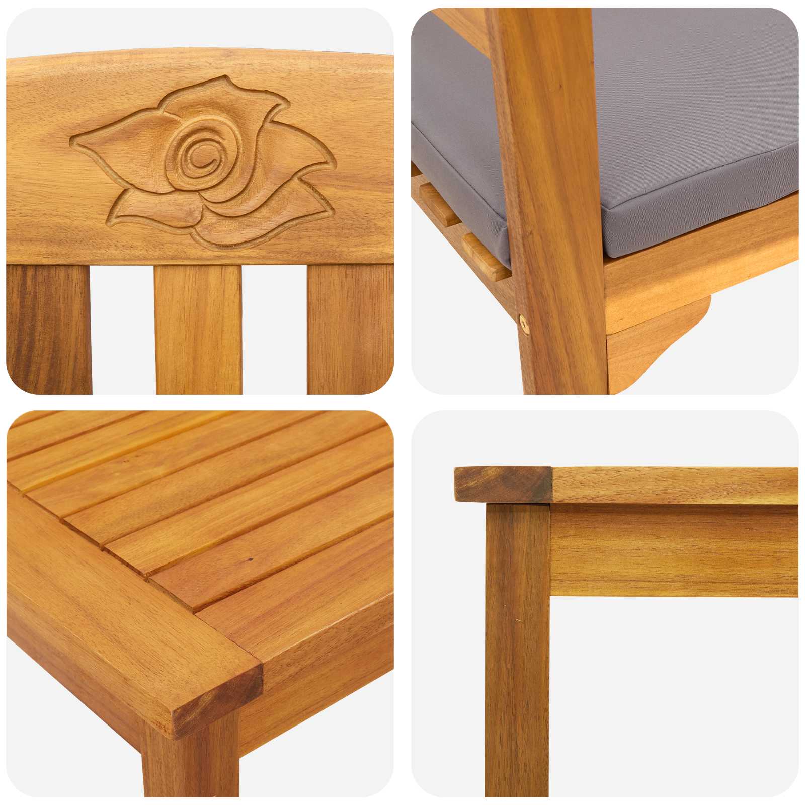 - Massief acaciahoutconstructie: De set is volledig gemaakt van massief acaciahout, wat zorgt voor een stevige en duurzame constructie. Het hout is bestand tegen verschillende weersomstandigheden, zodat je meubels buiten kunnen blijven staan. Gebruik een waterdichte hoes om de levensduur te verlengen.
