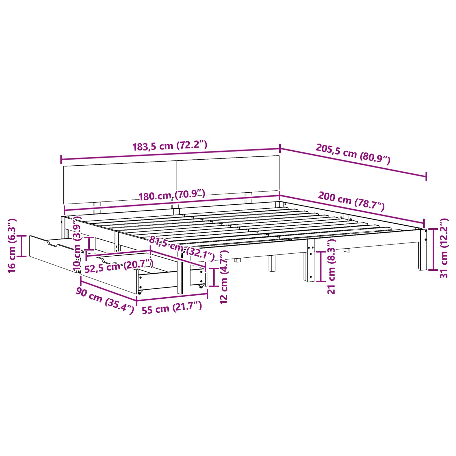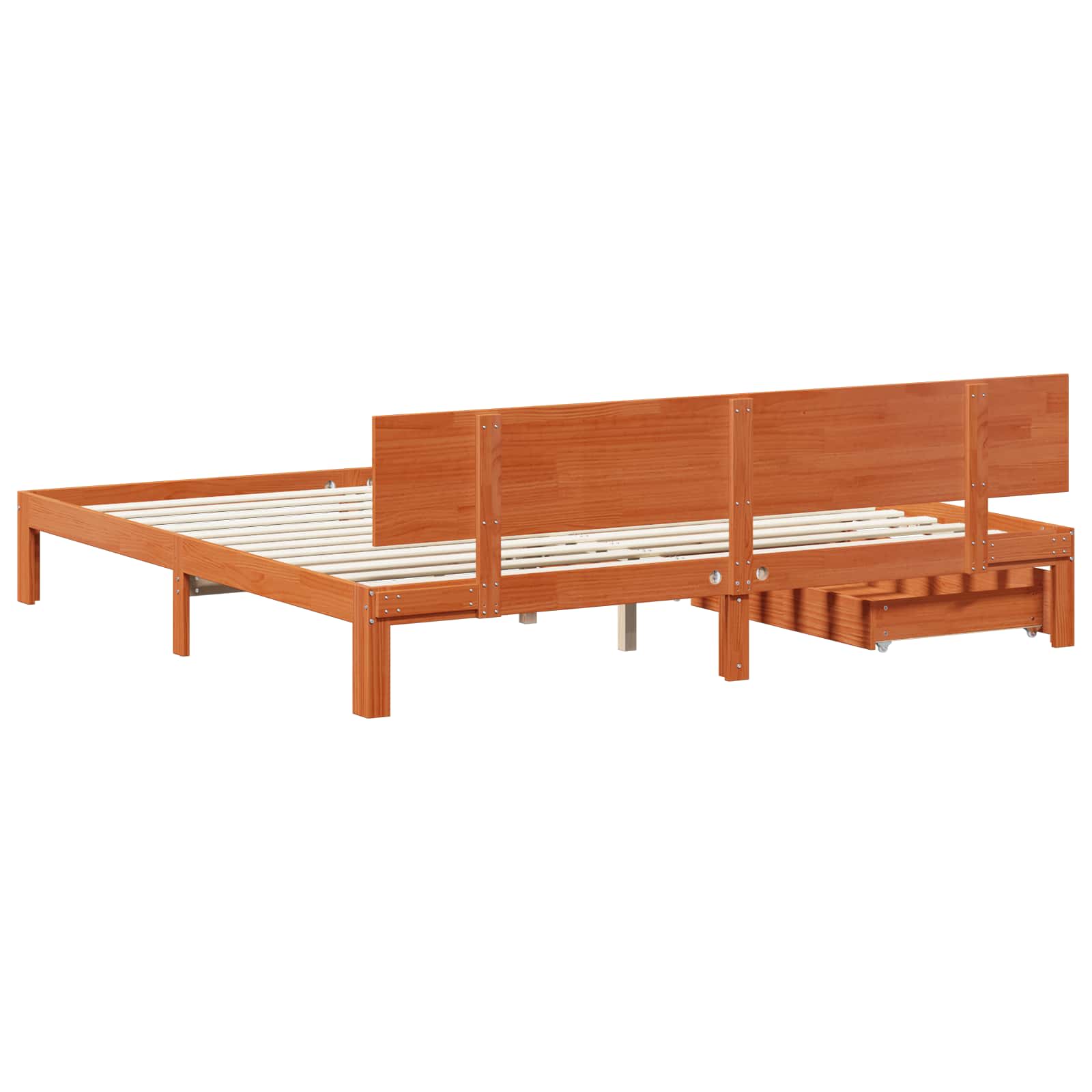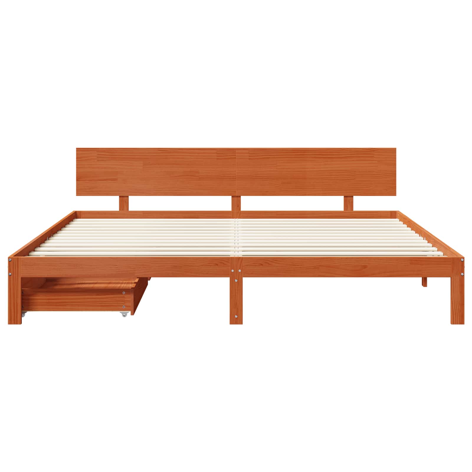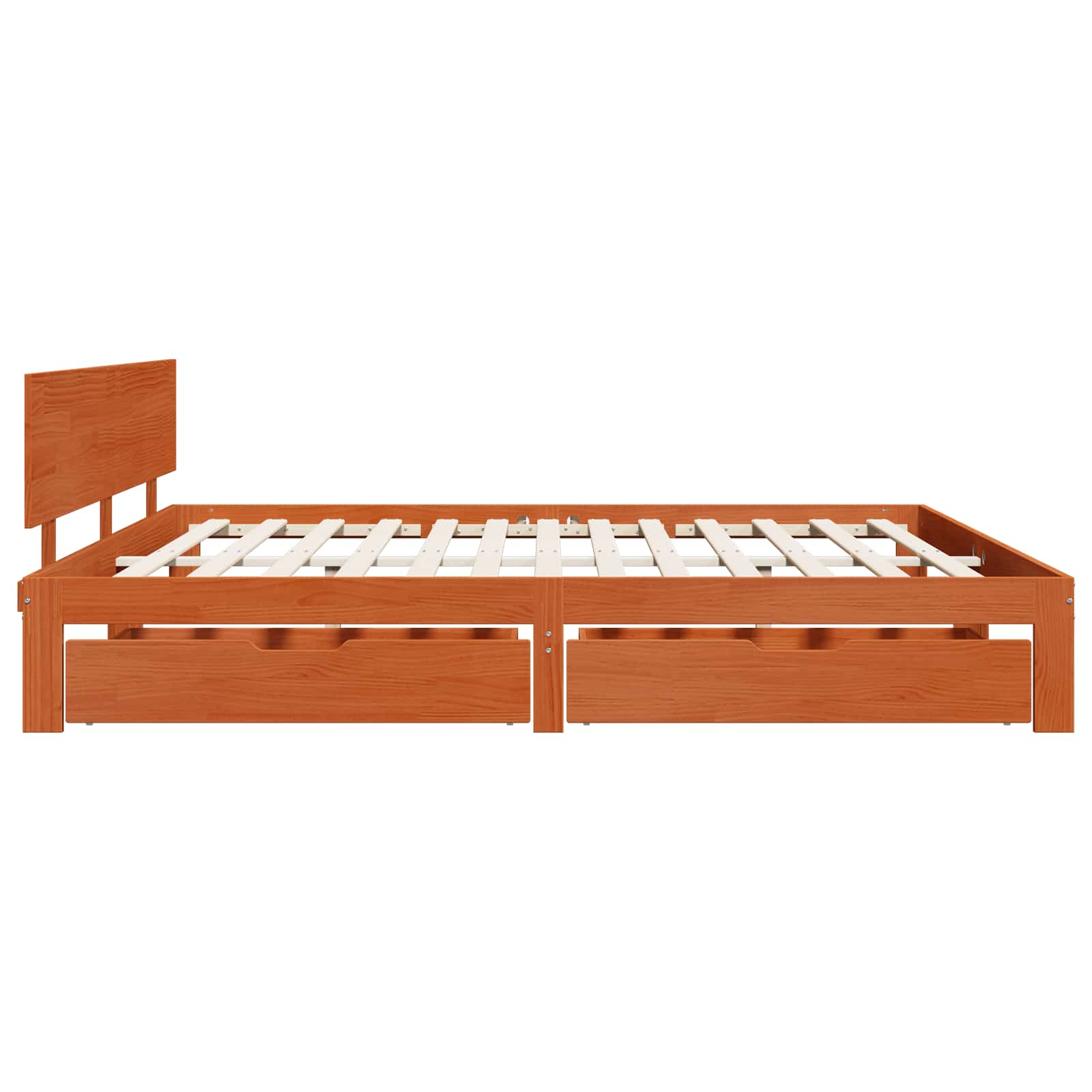 - Opberglades onder het bed: De lades onder het bed zijn slim ontworpen en glijden gemakkelijk open. Gemaakt van hetzelfde grenenhout, bieden ze praktische opbergruimte voor beddengoed of seizoenskleding zonder de uitstraling van het bed te verstoren.