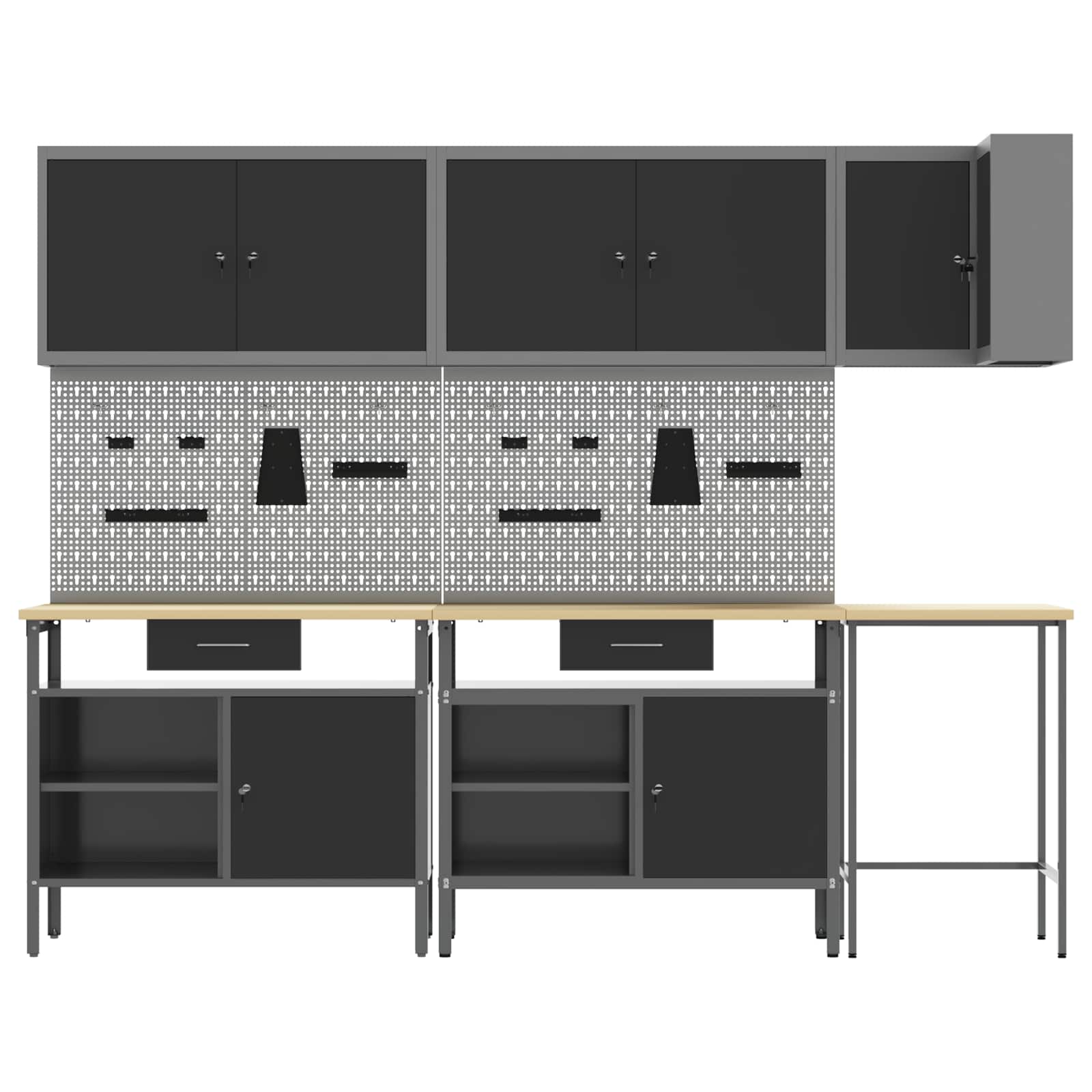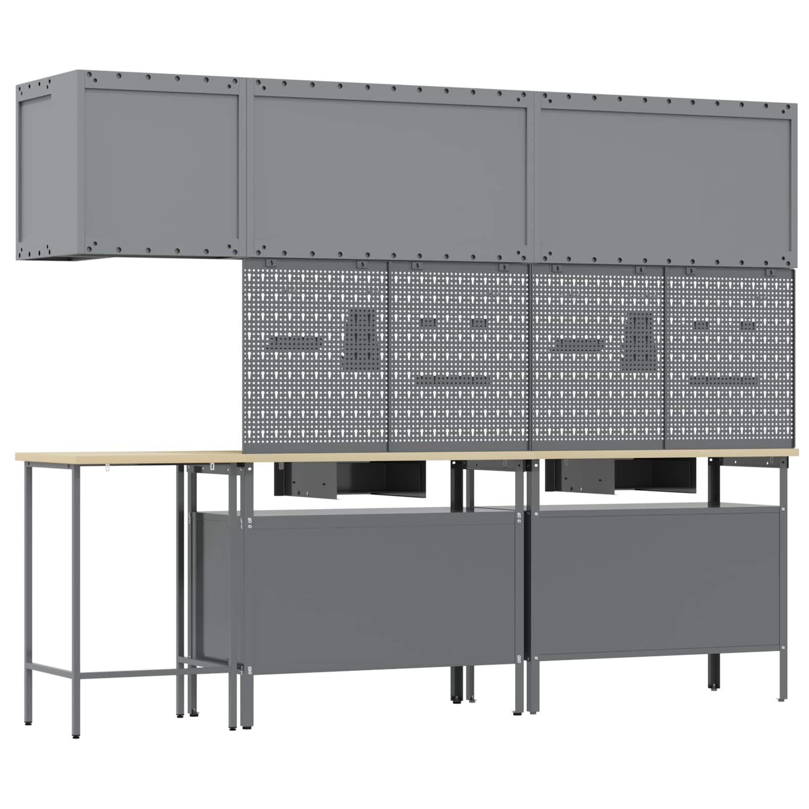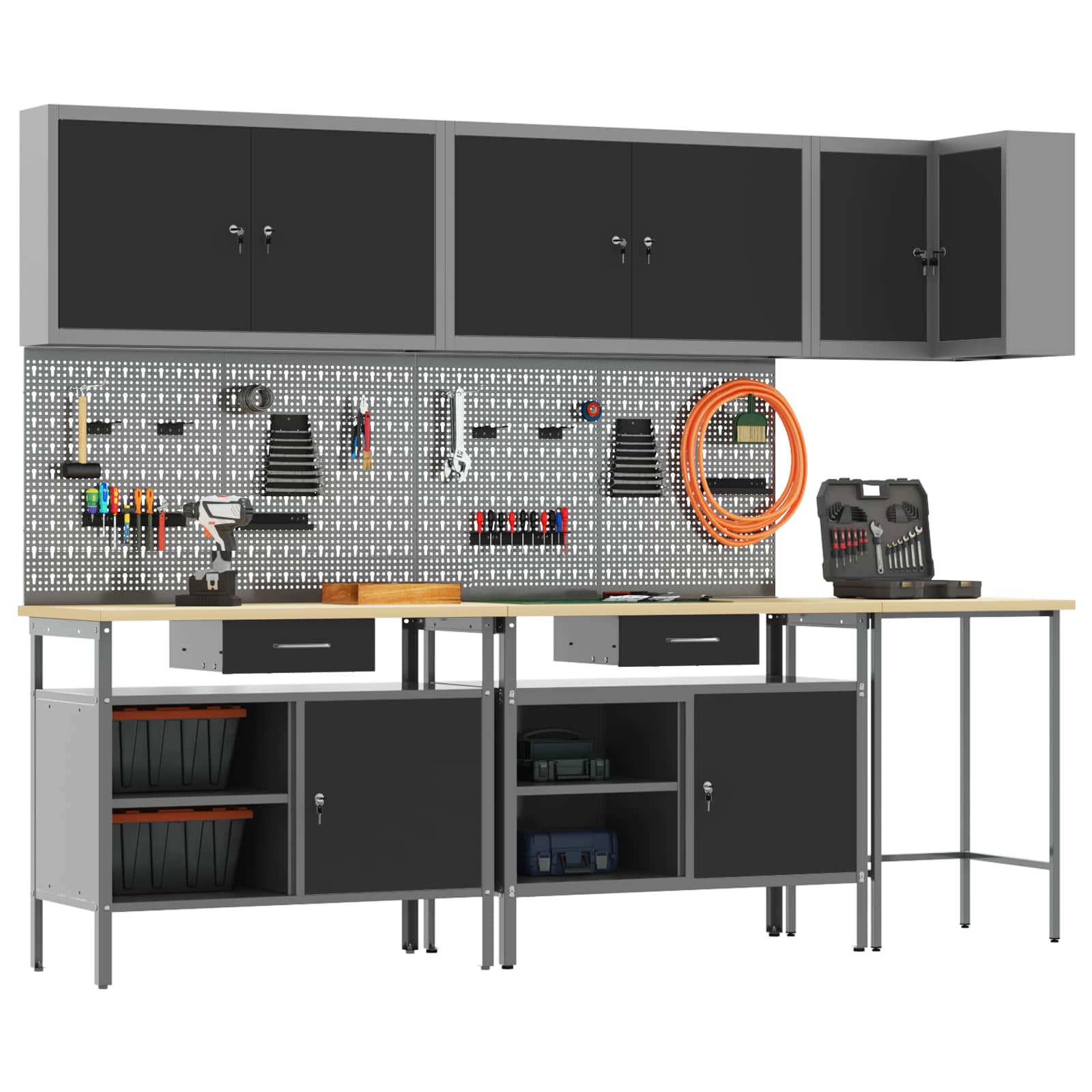 De duurzame werkcabinetset biedt een stevige en stijlvolle oplossing voor je gereedschap. Het moderne uiterlijk met strakke lijnen en een minimalistisch design zorgt ervoor dat je werkplek er professioneel uitziet.