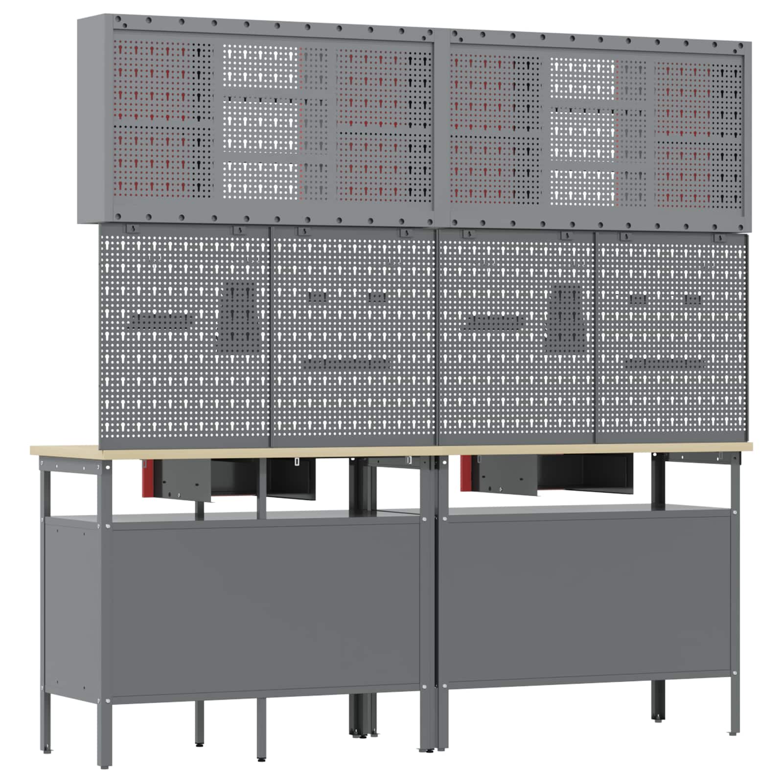 - Metalen schappen: De bijgeleverde metalen schappen bieden veel opbergruimte, zodat je gereedschap en apparatuur goed kunt organiseren. Deze schappen zijn ontworpen voor zwaar gebruik en kunnen veel gewicht aan, zodat je alles makkelijk kunt vinden.