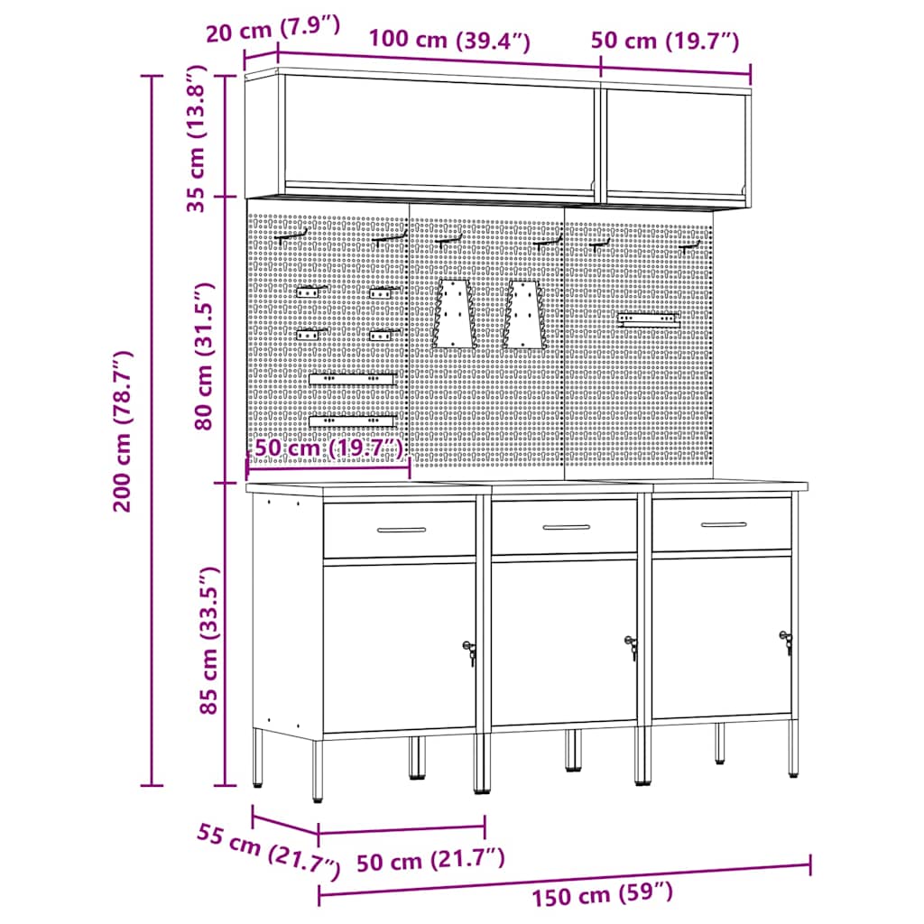 - Aanbevolen toepassingen: Dit cabinetsysteem is perfect voor gebruik in werkplaatsen en is geschikt voor tal van toepassingen. Het is een handige oplossing voor zowel klussers als professionals die hun gereedschap en accessoires georganiseerd willen houden, alles binnen handbereik zonder concessies te doen aan stijl.