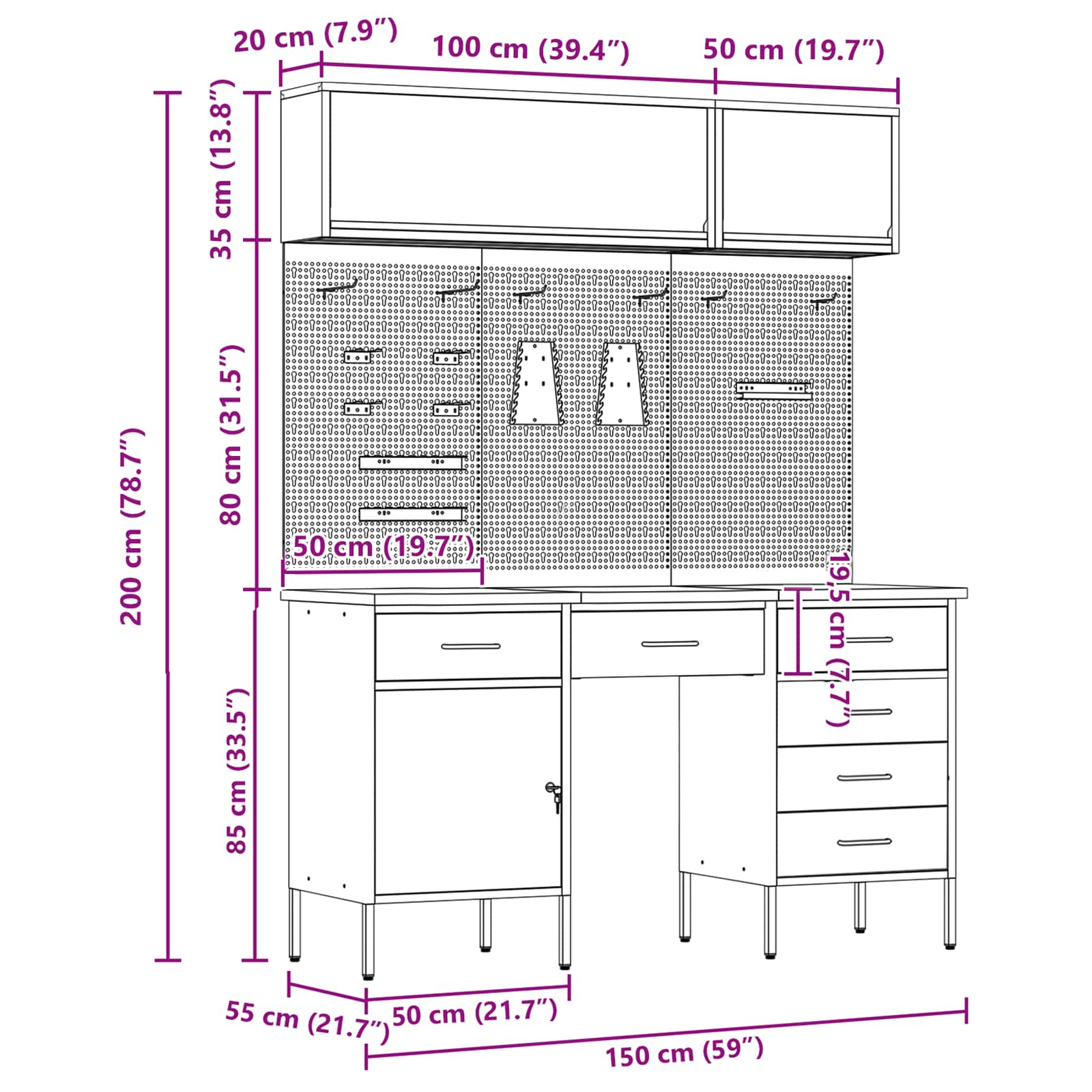 - Veelzijdige opslag: Met compartimenten, lades en planken biedt deze kast geweldige organisatieopties. Je kunt je gereedschap en materialen makkelijk ordenen, waardoor je werkruimte efficiënt is en alles op zijn plek blijft. Het slimme ontwerp voldoet aan allerlei opslagbehoeften, van grote gereedschappen tot kleine accessoires, waardoor het een must-have is voor georganiseerde werkruimtes.