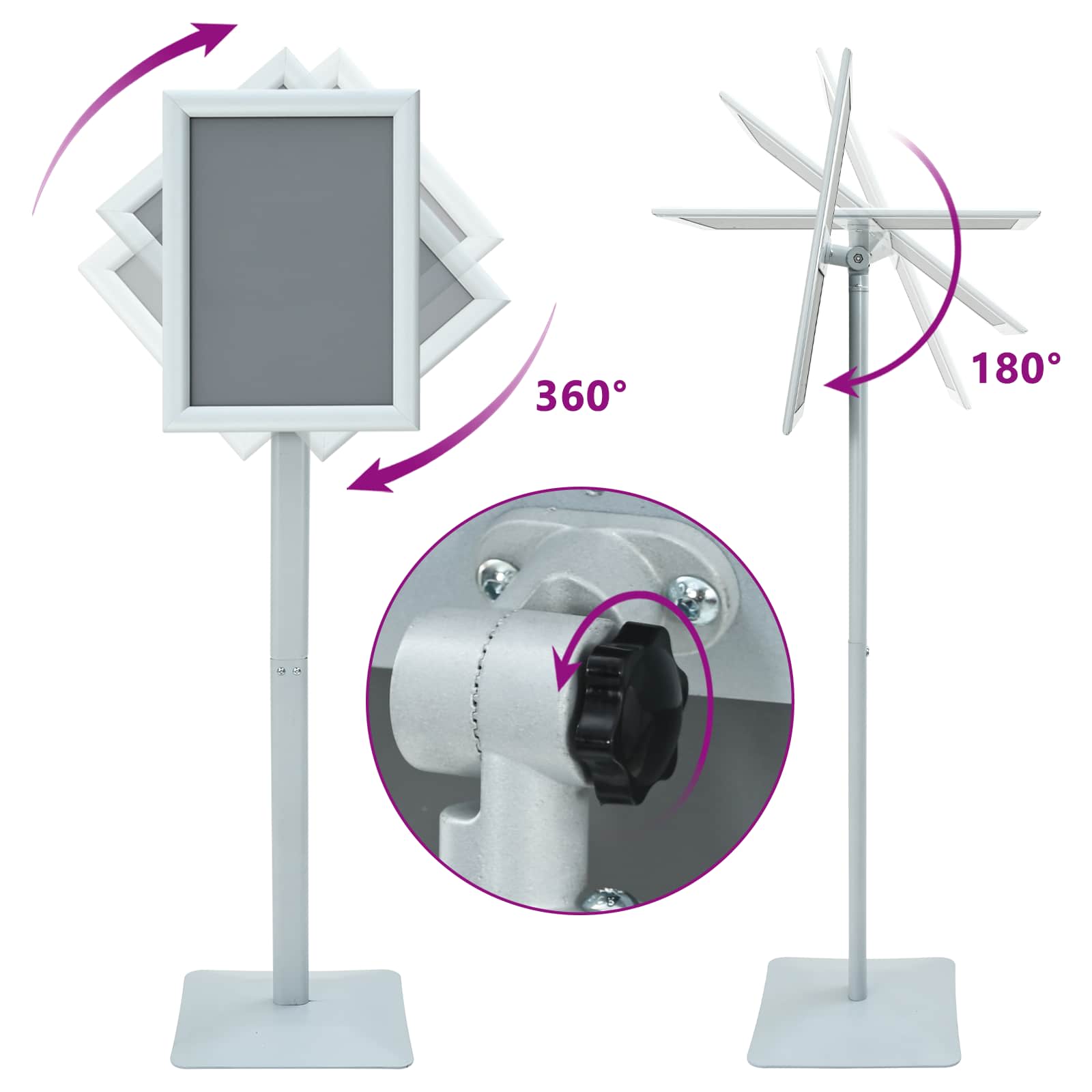 - Geschikt voor meerdere gebruiksdoelen: Deze standaard past zich gemakkelijk aan, of je ''m nu in een winkel, op een evenement of in de tuin gebruikt. Hij is draagbaar en makkelijk te verplaatsen, zodat je altijd kunt inspelen op wat nodig is. Of het nu gaat om aankondigingen of promoties, deze standaard geeft je de flexibiliteit die je zoekt.
