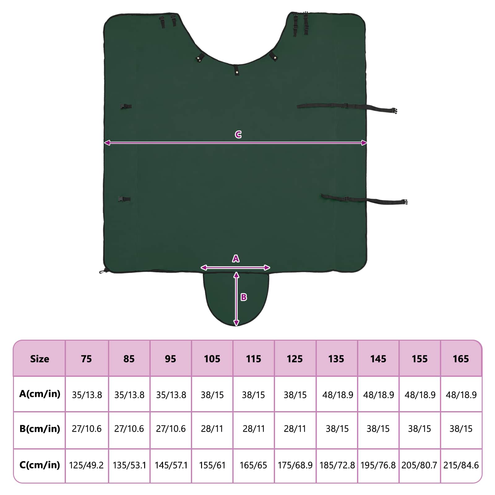 - Aanpasbare kenmerken: De deken heeft afneembare onderdelen, zodat je deze kunt aanpassen aan de grootte en het comfort van je paard. Zo zit hij snug, waardoor koude lucht buiten blijft.