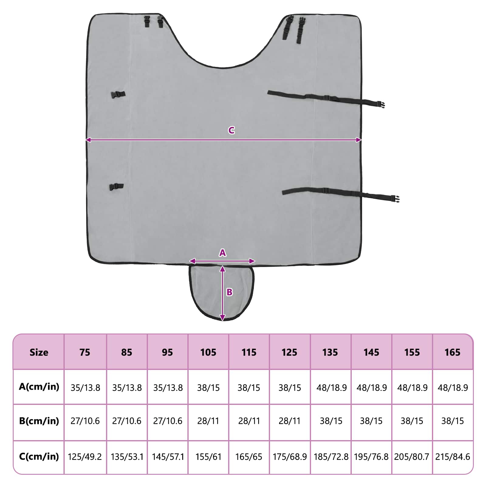 - Aanpasbare kenmerken: De deken heeft afneembare onderdelen, zodat je deze kunt aanpassen aan de grootte en het comfort van je paard. Zo zit hij snug, waardoor koude lucht buiten blijft.