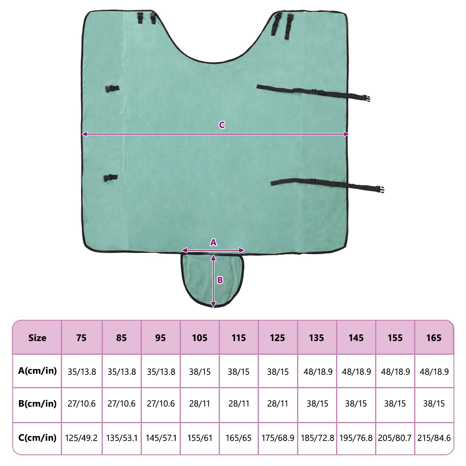 - Aanpasbare kenmerken: De deken heeft afneembare onderdelen, zodat je deze kunt aanpassen aan de grootte en het comfort van je paard. Zo zit hij snug, waardoor koude lucht buiten blijft.