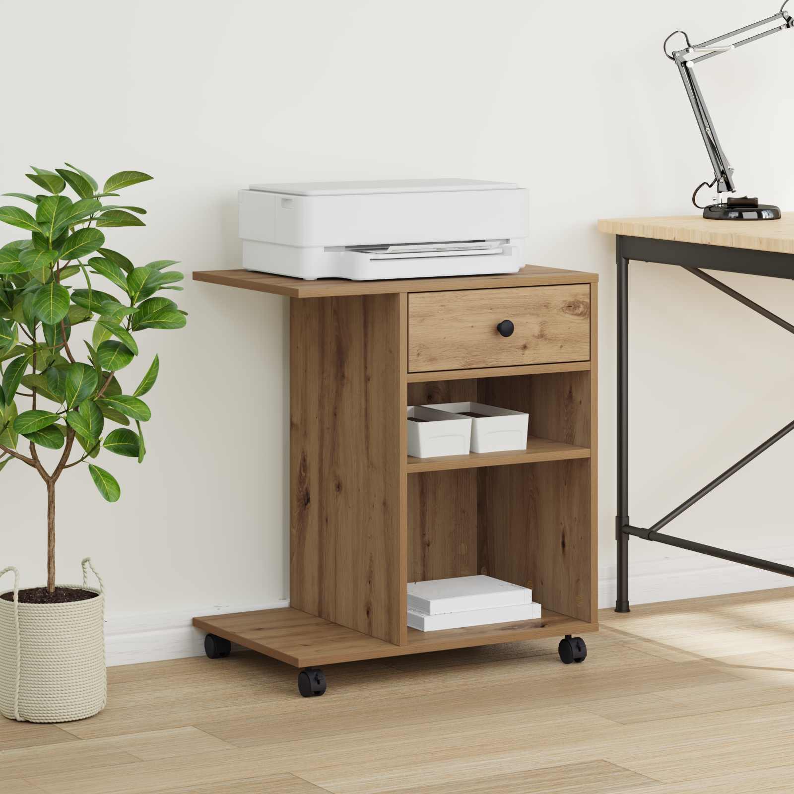 Deze moderne printerstand met wielen is een strak en functioneel alternatief voor je kantoorinrichting. Met zijn simpele lijnen en minimale versieringen sluit hij mooi aan bij de look van vandaag. De rechthoekige vorm biedt genoeg ruimte en dankzij de wielen kun je hem makkelijk verplaatsen. Het bewerkte hout dat gebruikt is, zorgt ervoor dat hij stevig en stijlvol is, perfect voor een professionele omgeving.
