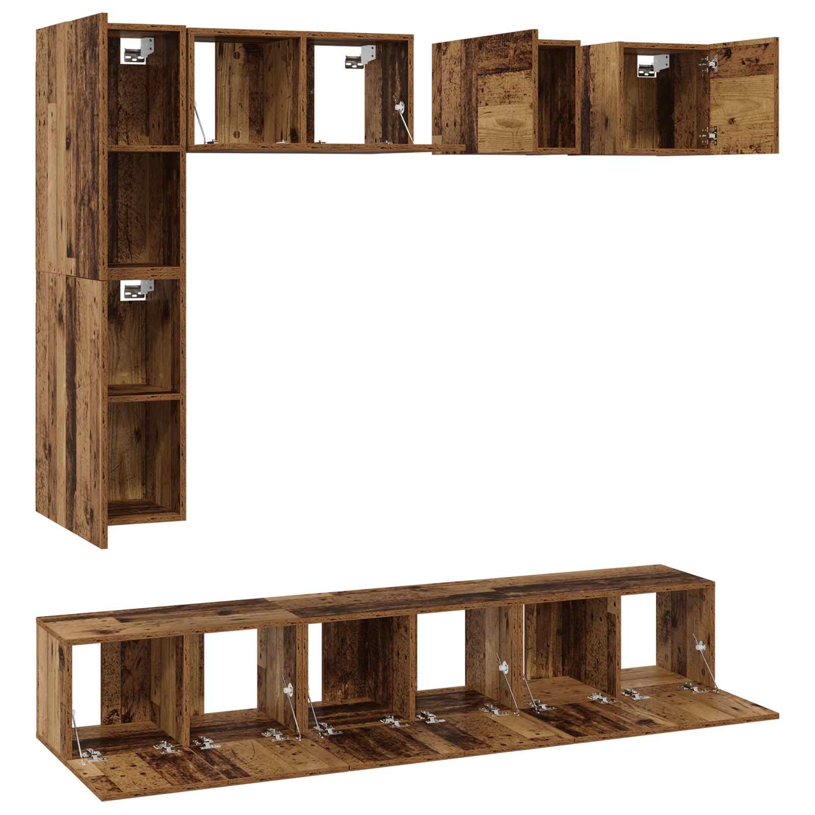 - Inclusief componenten: Iedere kast heeft een scharnierdeur die gemakkelijk toegang geeft tot de opbergruimtes. Het muur gemonteerde ontwerp maakt de vloer vrij, terwijl het een strak profiel houdt. De planken binnenin elke kast helpen bij het ordenen van alles, van boeken tot mediaspelers.