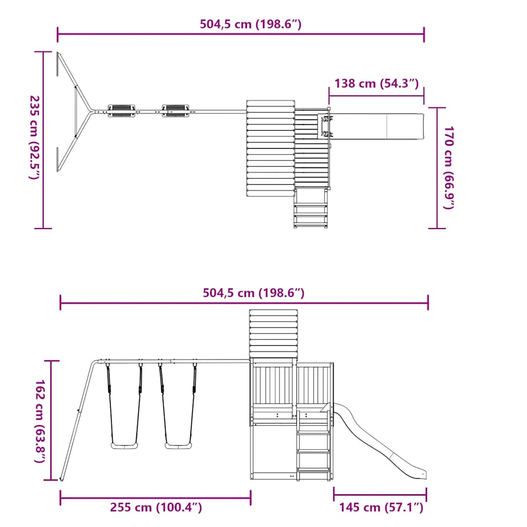 - Stevig en stabiel frame: het houten frame van het speeltoestel zorgt voor stevigheid en stabiliteit. Bovendien zorgen de "A"-vormige poten van de kinderschommel voor evenwicht.