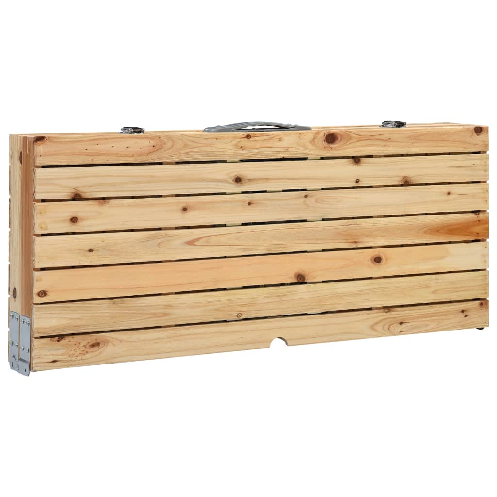 Het vurenhouten oppervlak draagt bij aan de natuurlijke charme terwijl het frame van hoogwaardig staal en aluminium de duurzaamheid en stevigheid verzekert. Dankzij het inklapbare ontwerp kunnen deze kampeertafel- en stoelen tot een koffer worden ingeklapt, waardoor ze gemakkelijk te vervoeren zijn en snel kunnen worden opgeborgen wanneer het meubel niet wordt gebruikt. Bovendien heeft het tafelblad een parasolgat, zodat je makkelijk een parasol kunt plaatsen.