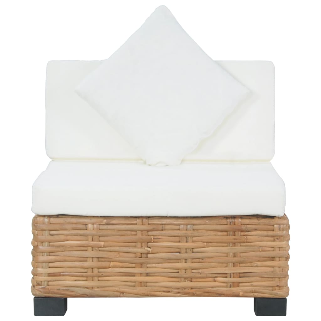 Het frame is bedekt met natuurlijk rattan, dat niet alleen aantrekkelijk is door zijn natuurlijke uitstraling en decoratieve weefpatronen, maar ook duurzaam is in gebruik. De bankpoten zijn gemaakt van mahonie- en mangohout, dat sterke ondersteuning en hoge stabiliteit biedt. De kussens voegen comfort en een gezellige sfeer toe. De armloze bank is eenvoudig te monteren. De levering bevat 1 bank zonder armleuning, 1 zitkussen, 1 rugkussen en 1 kussen.