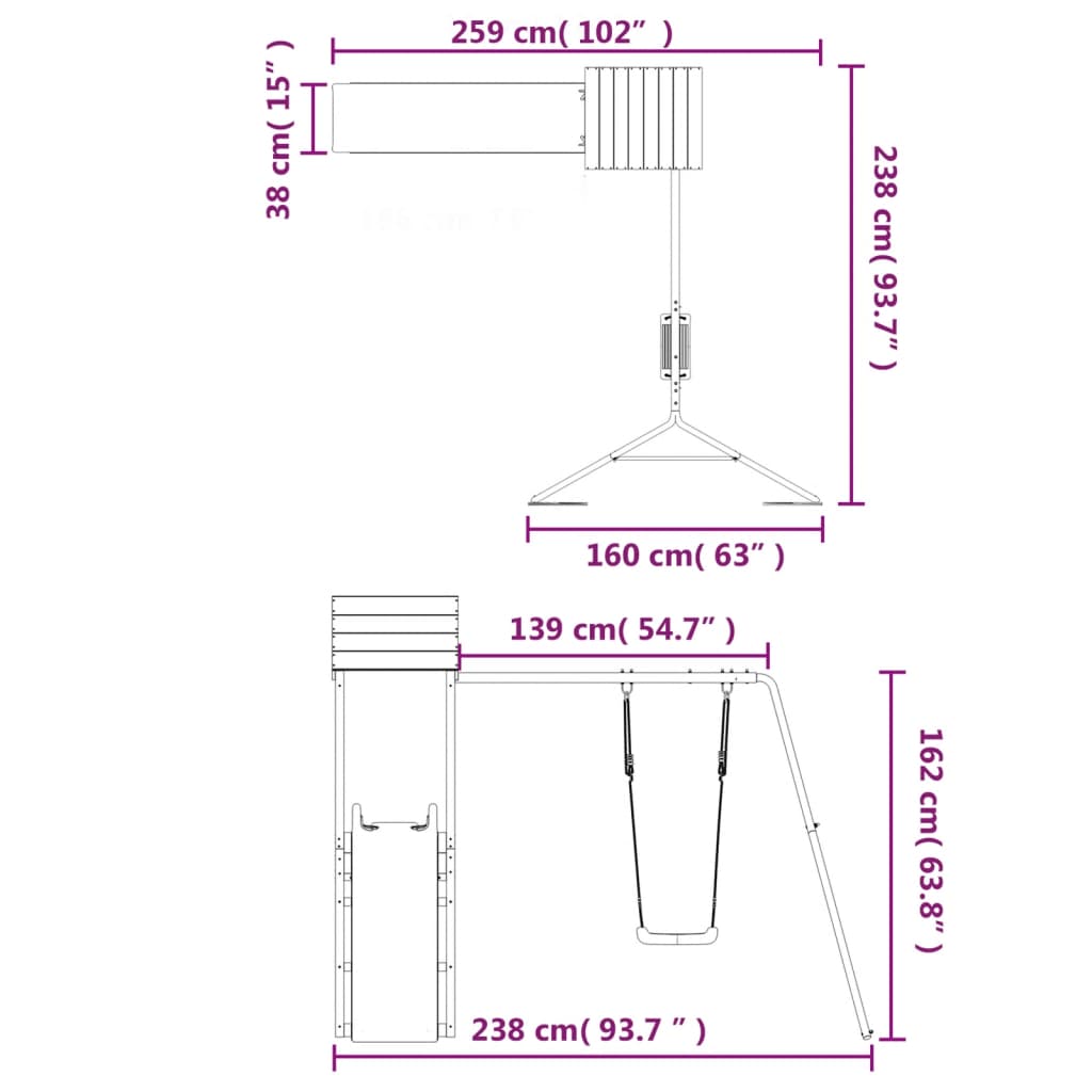 - Stevig en stabiel frame: het houten frame van het speelhuisje zorgt voor stevigheid en stabiliteit. Bovendien zorgen de "A"-vormige poten van de kinderschommel voor evenwicht.
