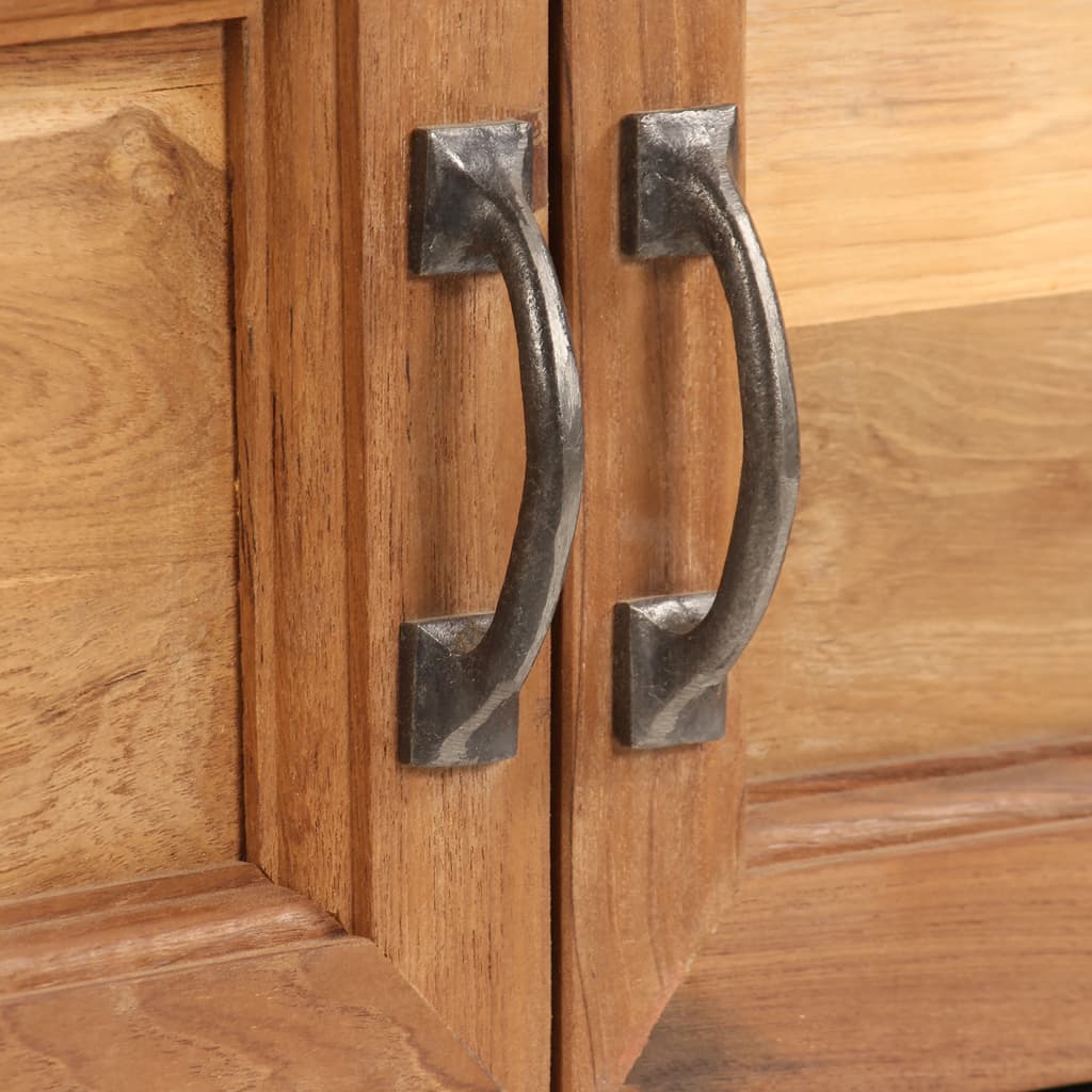 De tv-standaard is gemaakt van gerecycled teakhout dat door polijsten en lakken een prachtige afwerking heeft gekregen en de standaard een verfijnde uitstraling geeft. De prachtige houtnerven maken elk meubel uniek en enigszins anders dan de rest. Deze tv-eenheid heeft een stevig en stabiel oppervlak waarop je je tv, een fruitmand, een vaas en andere voorwerpen kunt plaatsen. Dit dressoir is voorzien van een kast en twee opbergvakken, die voldoende ruimte bieden voor het opbergen van multimedia-apparaten, mediadragers en andere spullen die je graag binnen handbereik wilt houden. Het stalen frame draagt bij aan de stevigheid en stabiliteit van de kast en geeft hem zijn industriële stijl. Dit product is al gemonteerd; er is geen montage vereist.