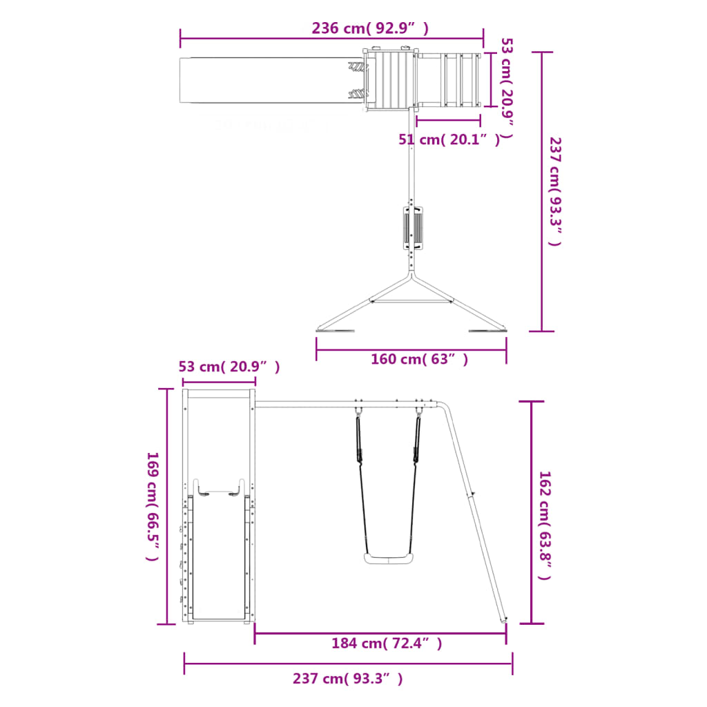 - Stevig en stabiel frame: het houten frame van het speeltoestel zorgt voor stevigheid en stabiliteit. Bovendien zorgen de "A"-vormige poten van de kinderschommel voor evenwicht.
