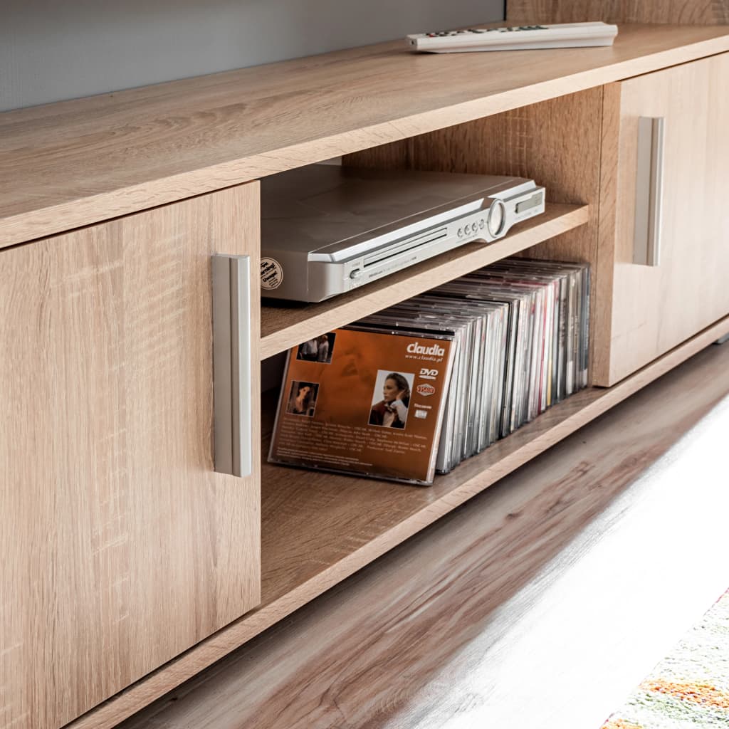 De wandunit, bestaande uit 2 zijkasten in verschillende afmetingen, 1 tv-kast en 1 wandplank, biedt voldoende ruimte om je multimedia-apparaten, dvd-speler, mediadragers, boeken en allerlei kleinere voorwerpen op te bergen. Hij is ook ideaal voor het plaatsen van decoratieve objecten, fotolijsten en zelfs potplanten. De linkerkast heeft 3 glazen schappen met energiezuinige witte LED-verlichting om een aantrekkelijke sfeer te creëren.