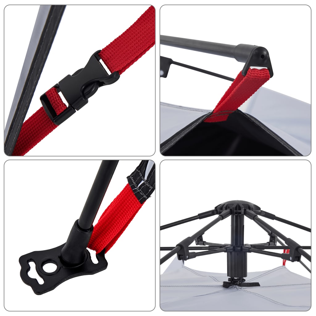 - Snelspansysteem: zet de tent moeiteloos op met het snelspansysteem! Leg de tent op de grond, schuif de voorgemonteerde stokken uit tot ze vastklikken en je bent klaar!